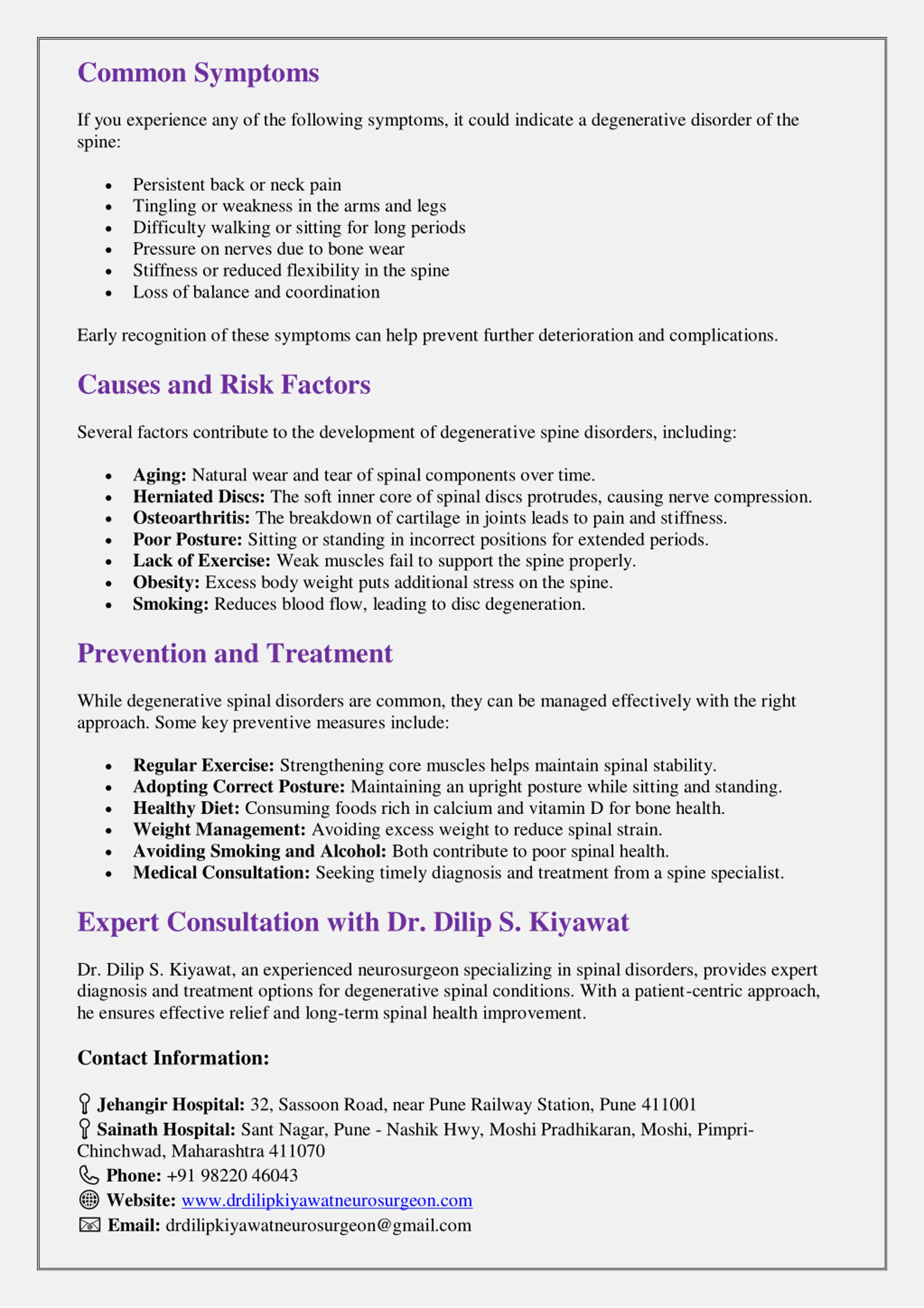 Common Symptoms If you experience any of the following symptoms, it could indicate a degenerative disorder of the spine: Persistent back or neck pain Tingling or weakness in the arms and legs Difficulty walking or sitting for long periods Pressure on nerves due to bone wear Stiffness or reduced flexibility in the spine Loss of balance and coordination Early recognition of these symptoms can help prevent further deterioration and complications. Causes and Risk Factors Several factors contribute to the development of degenerative spine disorders, including: Aging: Natural wear and tear of spinal components over time. Herniated Discs: The soft inner core of spinal discs protrudes, causing nerve compression. Osteoarthritis: The breakdown of cartilage in joints leads to pain and stiffness. Poor Posture: Sitting or standing in incorrect positions for extended periods. Lack of Exercise: Weak muscles fail to support the spine properly. Obesity: Excess body weight puts additional stress on the spine. Smoking: Reduces blood flow, leading to disc degeneration. Prevention and Treatment While degenerative spinal disorders are common, they can be managed effectively with the right approach. Some key preventive measures include: Regular Exercise: Strengthening core muscles helps maintain spinal stability. Adopting Correct Posture: Maintaining an upright posture while sitting and standing. Healthy Diet: Consuming foods rich in calcium and vitamin D for bone health. Weight Management: Avoiding excess weight to reduce spinal strain. Avoiding Smoking and Alcohol: Both contribute to poor spinal health. Medical Consultation: Seeking timely diagnosis and treatment from a spine specialist. Expert Consultation with Dr. Dilip S. Kiyawat Dr. Dilip S. Kiyawat, an experienced neurosurgeon specializing in spinal disorders, provides expert diagnosis and treatment options for degenerative spinal conditions. With a patient-centric approach, he ensures effective relief and long-term spinal health improvement. Contact Information: ?Jehangir Hospital: 32, Sassoon Road, near Pune Railway Station, Pune 411001 ?Sainath Hospital: Sant Nagar, Pune - Nashik Hwy, Moshi Pradhikaran, Moshi, Pimpri- Chinchwad, Maharashtra 411070 ?Phone: +91 98220 46043 ?Website: www.drdilipkiyawatneurosurgeon.com ?Email: drdilipkiyawatneurosurgeon@gmail.com