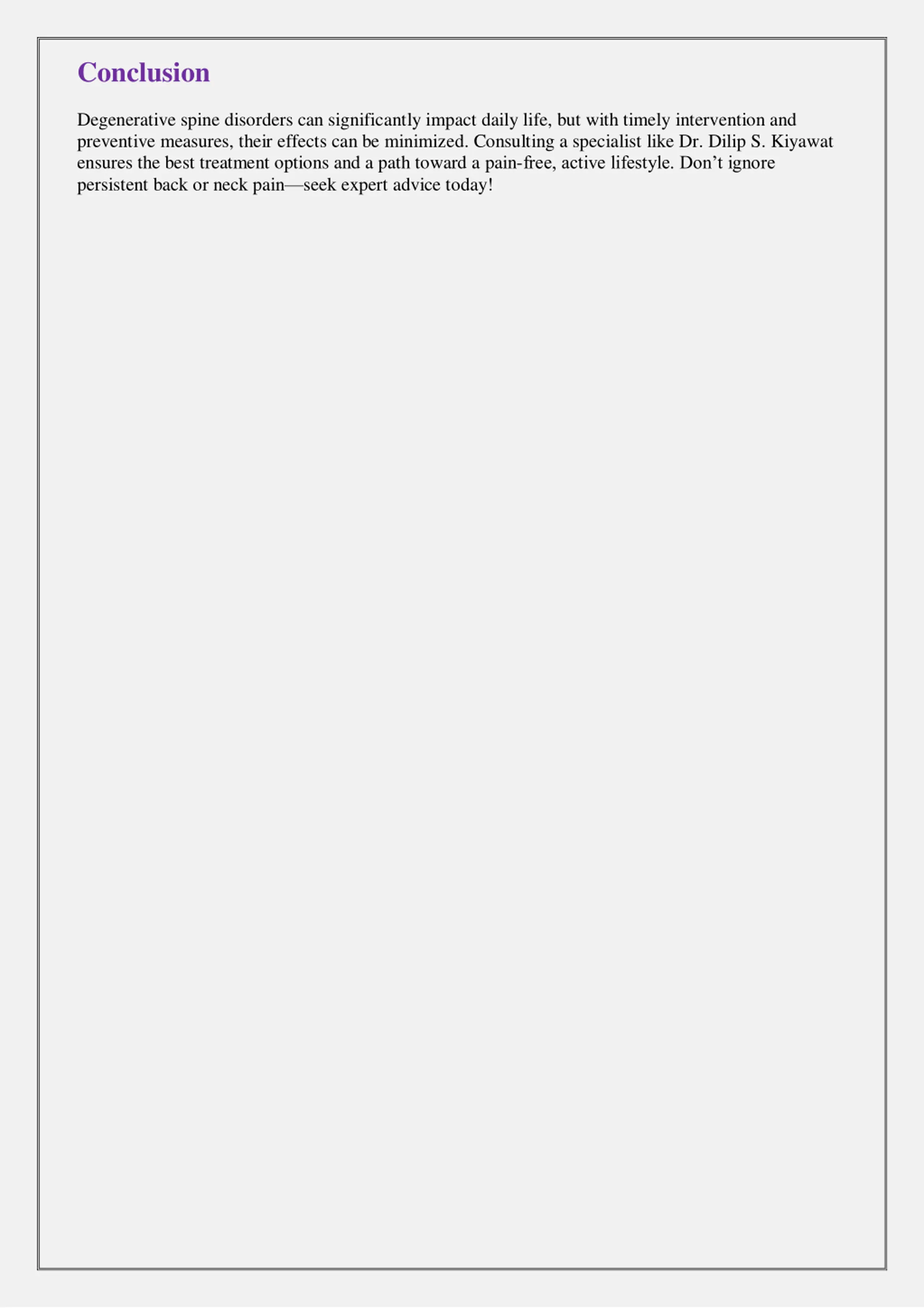 Conclusion Degenerative spine disorders can significantly impact daily life, but with timely intervention and preventive measures, their effects can be minimized. Consulting a specialist like Dr. Dilip S. Kiyawat ensures the best treatment options and a path toward a pain-free, active lifestyle. Don t ignore persistent back or neck pain seek expert advice today!