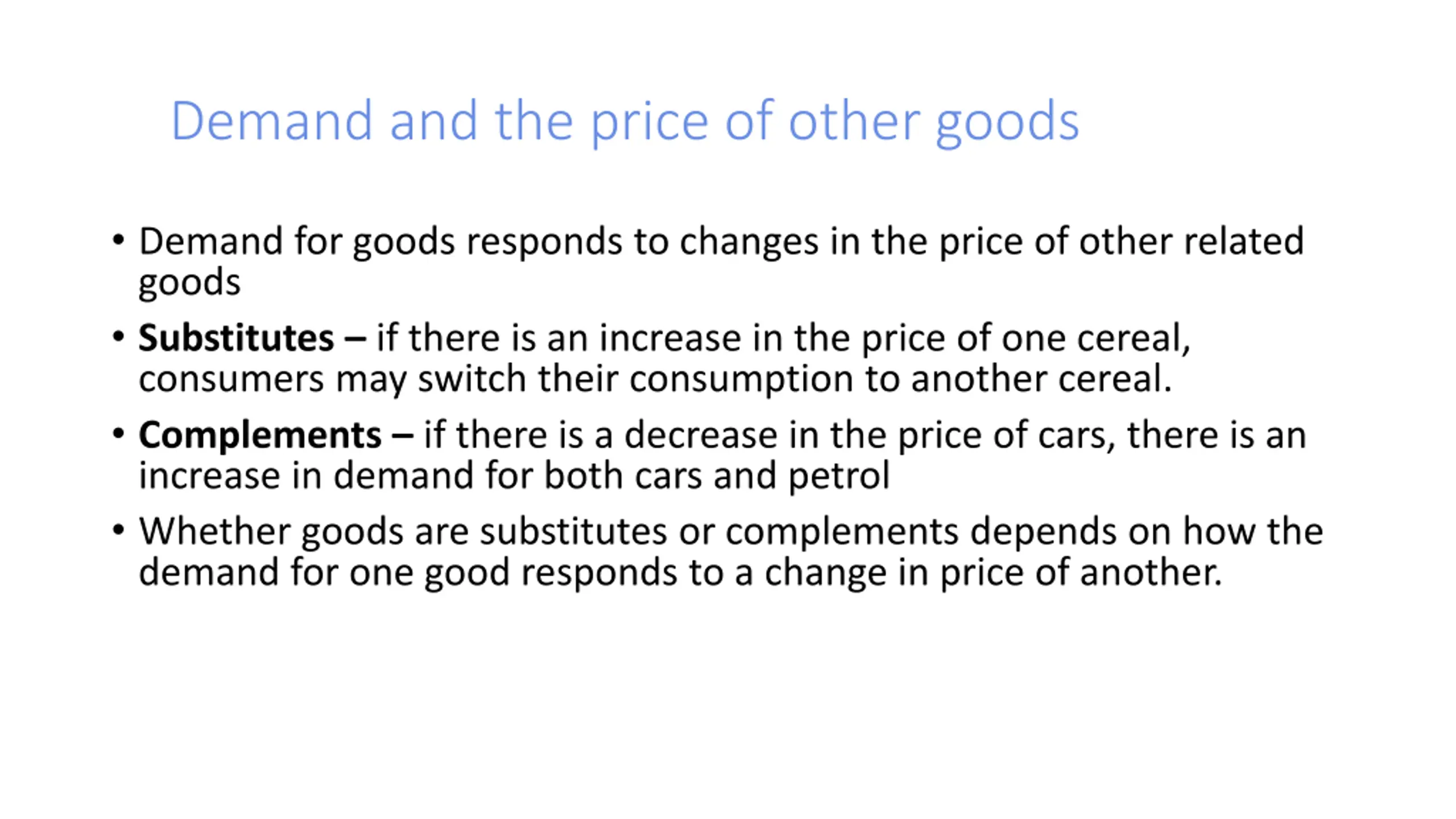 Demand and the price of other goods Demand for goods responds to changes in the price of other related goods Substitutes if there is an increase in the price of one cereal, consumers may switch their consumption to another cereal. Complements if there is a decrease in the price of cars, there is an increase in demand for both cars and petrol Whether goods are substitutes or complements depends on how the demand for one good responds to a change in price of another.