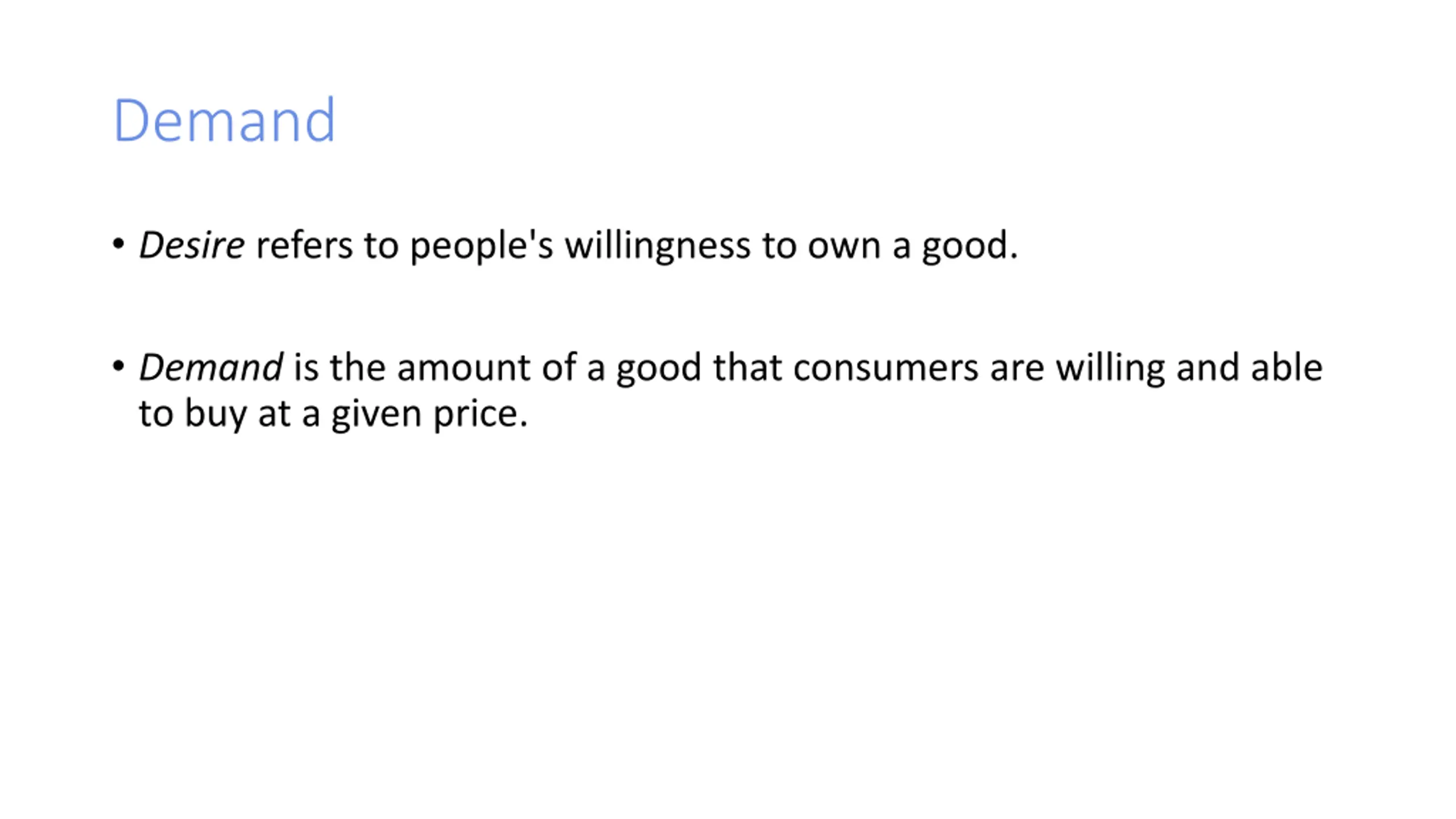 Demand Desire refers to people's willingness to own a good. Demand is the amount of a good that consumers are willing and able to buy at a given price.