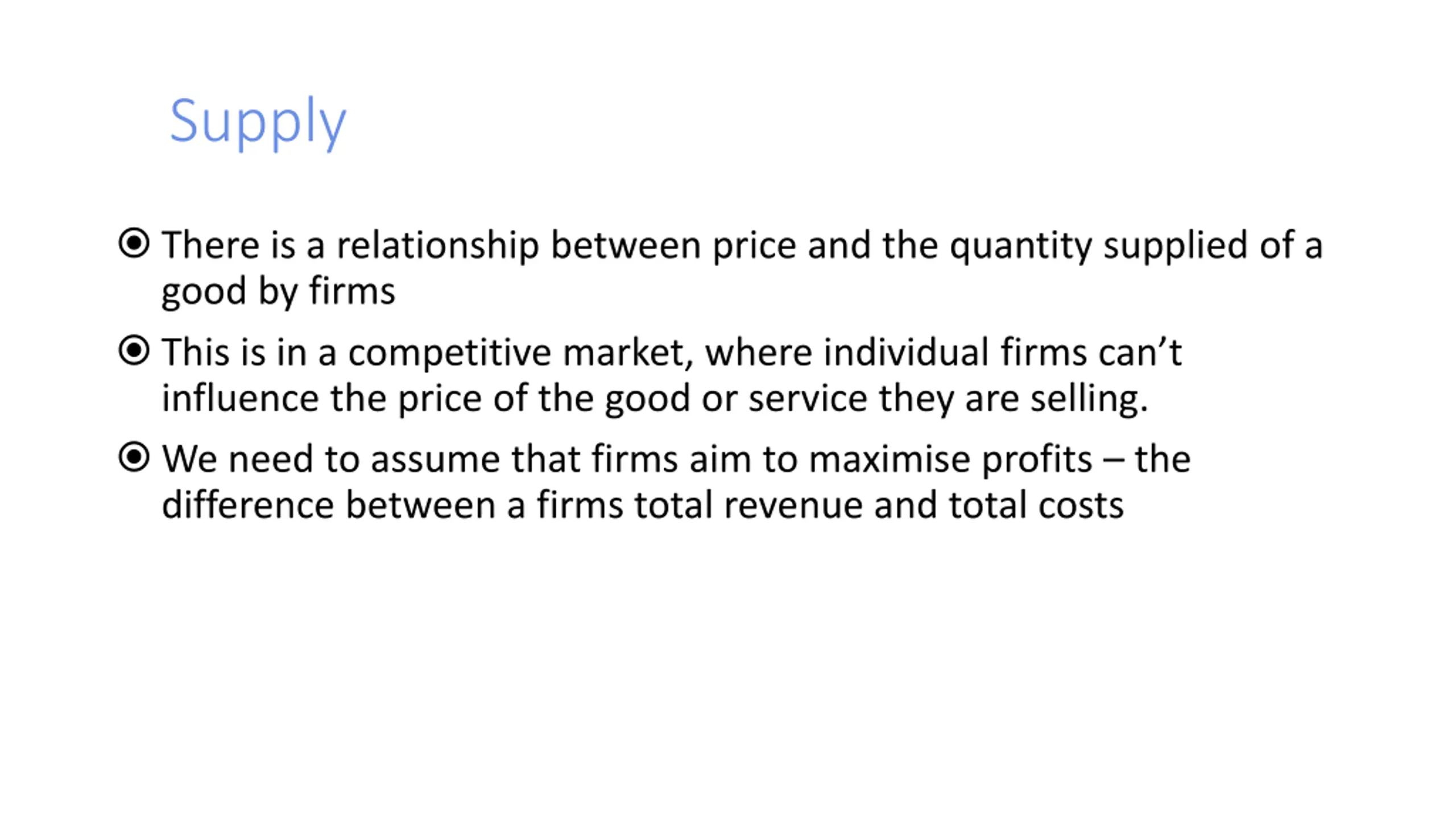 Supply There is a relationship between price and the quantity supplied of a good by firms This is in a competitive market, where individual firms can t influence the price of the good or service they are selling. We need to assume that firms aim to maximise profits the difference between a firms total revenue and total costs