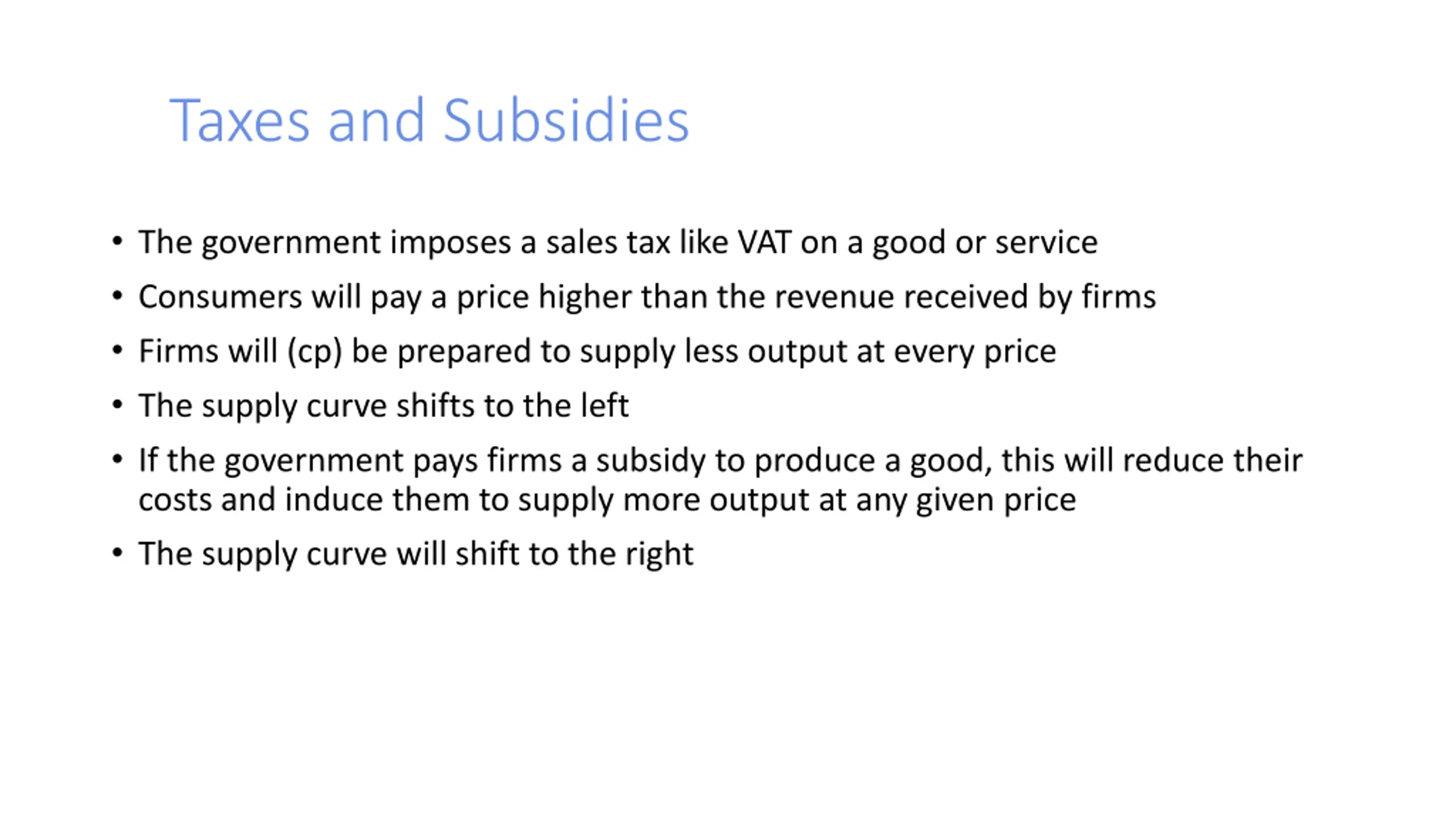 Taxes and Subsidies The government imposes a sales tax like VAT on a good or service Consumers will pay a price higher than the revenue received by firms Firms will (cp) be prepared to supply less output at every price The supply curve shifts to the left If the government pays firms a subsidy to produce a good, this will reduce their costs and induce them to supply more output at any given price The supply curve will shift to the right
