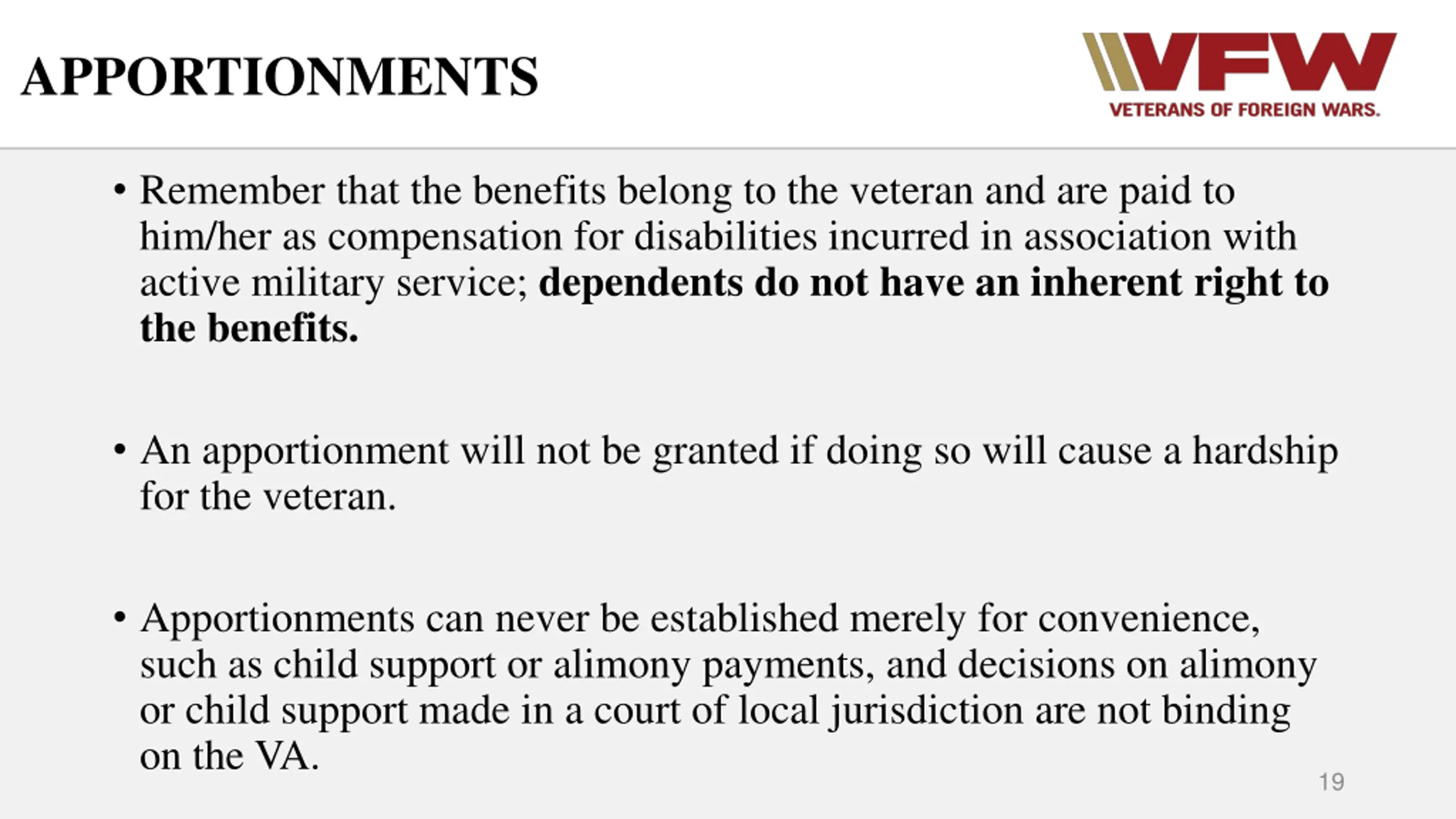 APPORTIONMENTS Remember that the benefits belong to the veteran and are paid to him/her as compensation for disabilities incurred in association with active military service; dependents do not have an inherent right to the benefits. An apportionment will not be granted if doing so will cause a hardship for the veteran. Apportionments can never be established merely for convenience, such as child support or alimony payments, and decisions on alimony or child support made in a court of local jurisdiction are not binding on the VA. 19