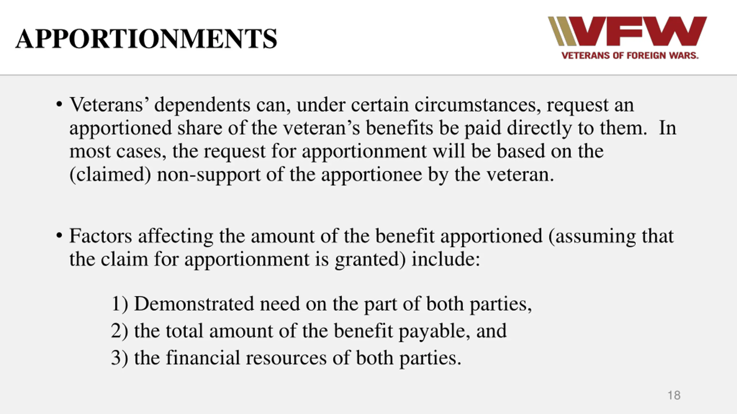 APPORTIONMENTS Veterans dependents can, under certain circumstances, request an apportioned share of the veteran s benefits be paid directly to them. In most cases, the request for apportionment will be based on the (claimed) non-support of the apportionee by the veteran. Factors affecting the amount of the benefit apportioned (assuming that the claim for apportionment is granted) include: 1) Demonstrated need on the part of both parties, 2) the total amount of the benefit payable, and 3) the financial resources of both parties. 18