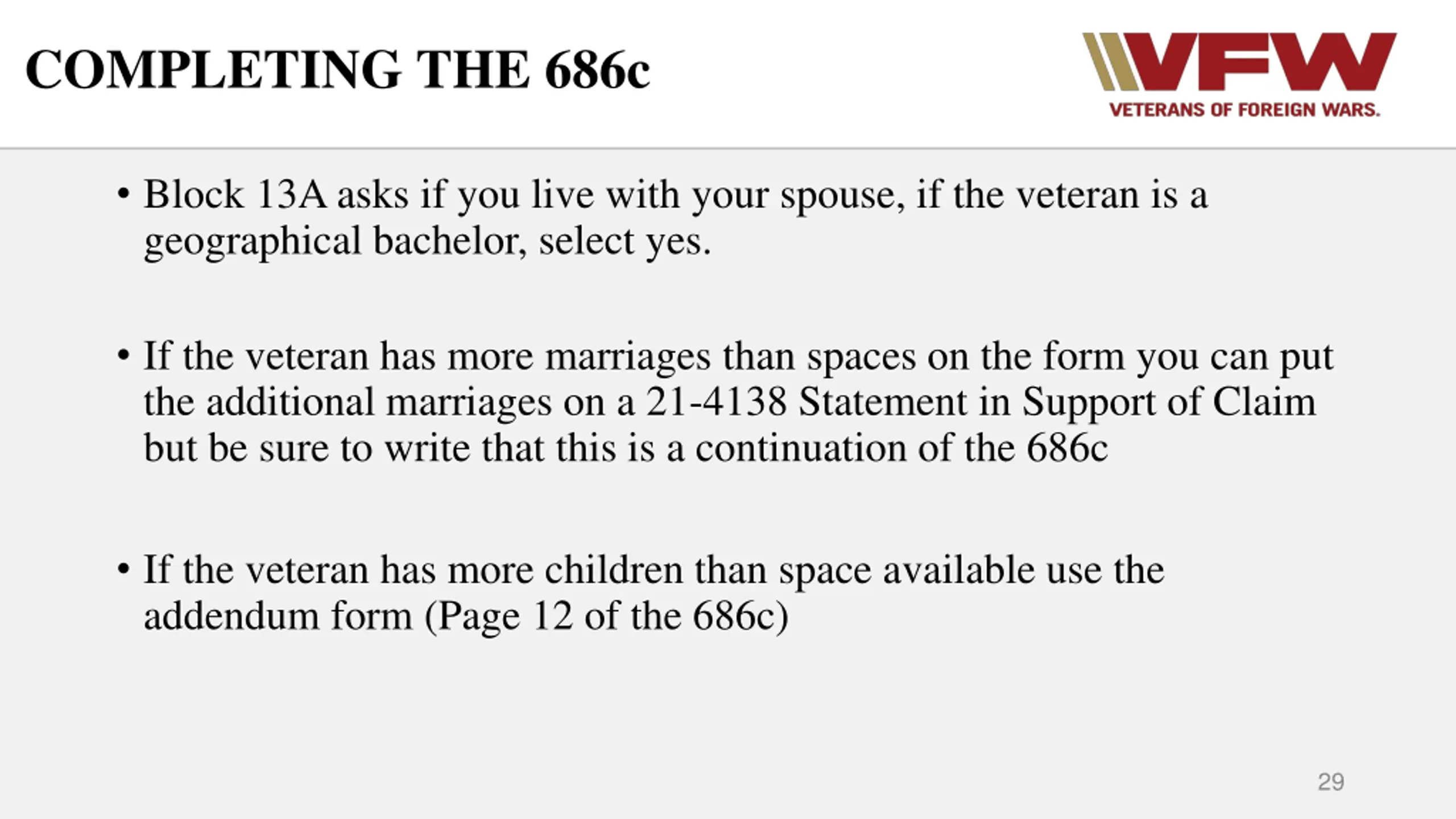 COMPLETING THE 686c Block 13A asks if you live with your spouse, if the veteran is a geographical bachelor, select yes. If the veteran has more marriages than spaces on the form you can put the additional marriages on a 21-4138 Statement in Support of Claim but be sure to write that this is a continuation of the 686c If the veteran has more children than space available use the addendum form (Page 12 of the 686c) 29