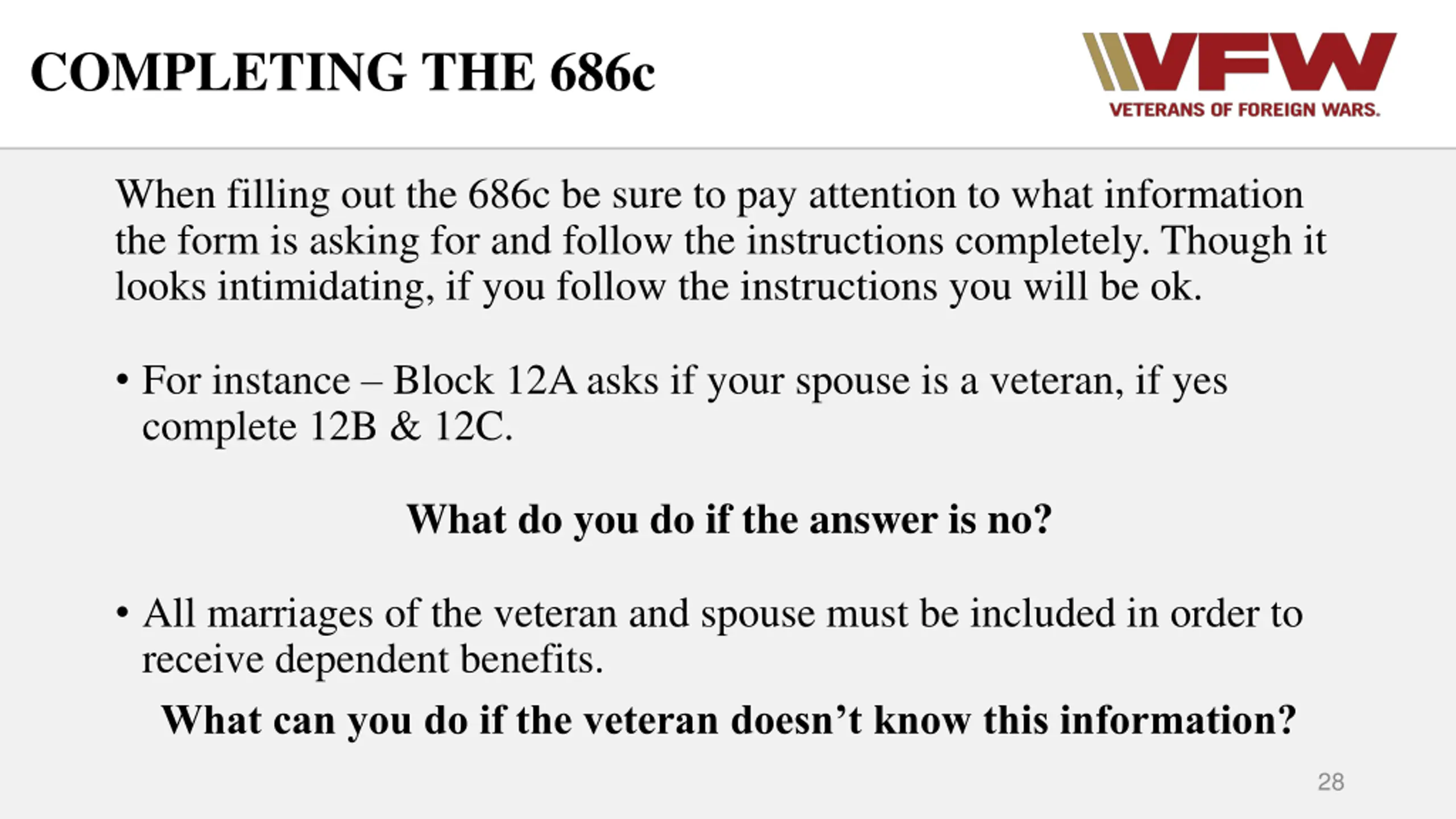 COMPLETING THE 686c When filling out the 686c be sure to pay attention to what information the form is asking for and follow the instructions completely. Though it looks intimidating, if you follow the instructions you will be ok. For instance Block 12A asks if your spouse is a veteran, if yes complete 12B & 12C. What do you do if the answer is no? All marriages of the veteran and spouse must be included in order to receive dependent benefits. What can you do if the veteran doesn t know this information? 28