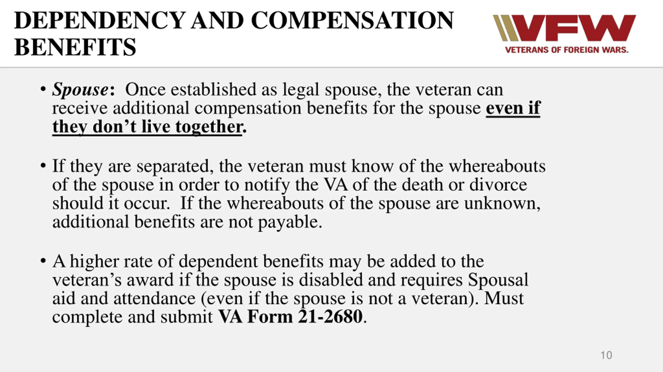 DEPENDENCY AND COMPENSATION BENEFITS Spouse: Once established as legal spouse, the veteran can receive additional compensation benefits for the spouse even if they don t live together. If they are separated, the veteran must know of the whereabouts of the spouse in order to notify the VA of the death or divorce should it occur. If the whereabouts of the spouse are unknown, additional benefits are not payable. A higher rate of dependent benefits may be added to the veteran s award if the spouse is disabled and requires Spousal aid and attendance (even if the spouse is not a veteran). Must complete and submit VA Form 21-2680. 10