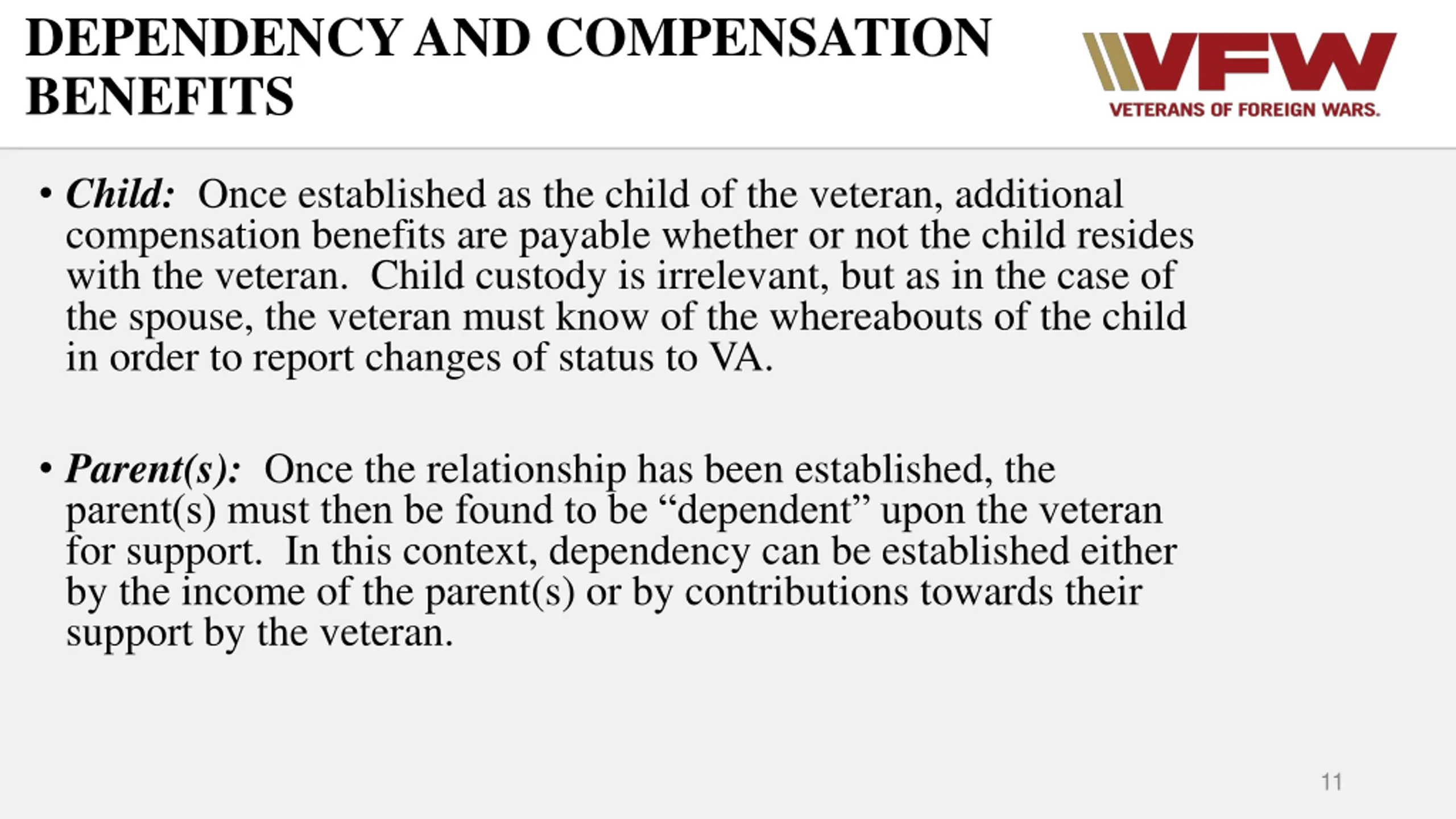DEPENDENCY AND COMPENSATION BENEFITS Child: Once established as the child of the veteran, additional compensation benefits are payable whether or not the child resides with the veteran. Child custody is irrelevant, but as in the case of the spouse, the veteran must know of the whereabouts of the child in order to report changes of status to VA. Parent(s): Once the relationship has been established, the parent(s) must then be found to be dependent upon the veteran for support. In this context, dependency can be established either by the income of the parent(s) or by contributions towards their support by the veteran. 11