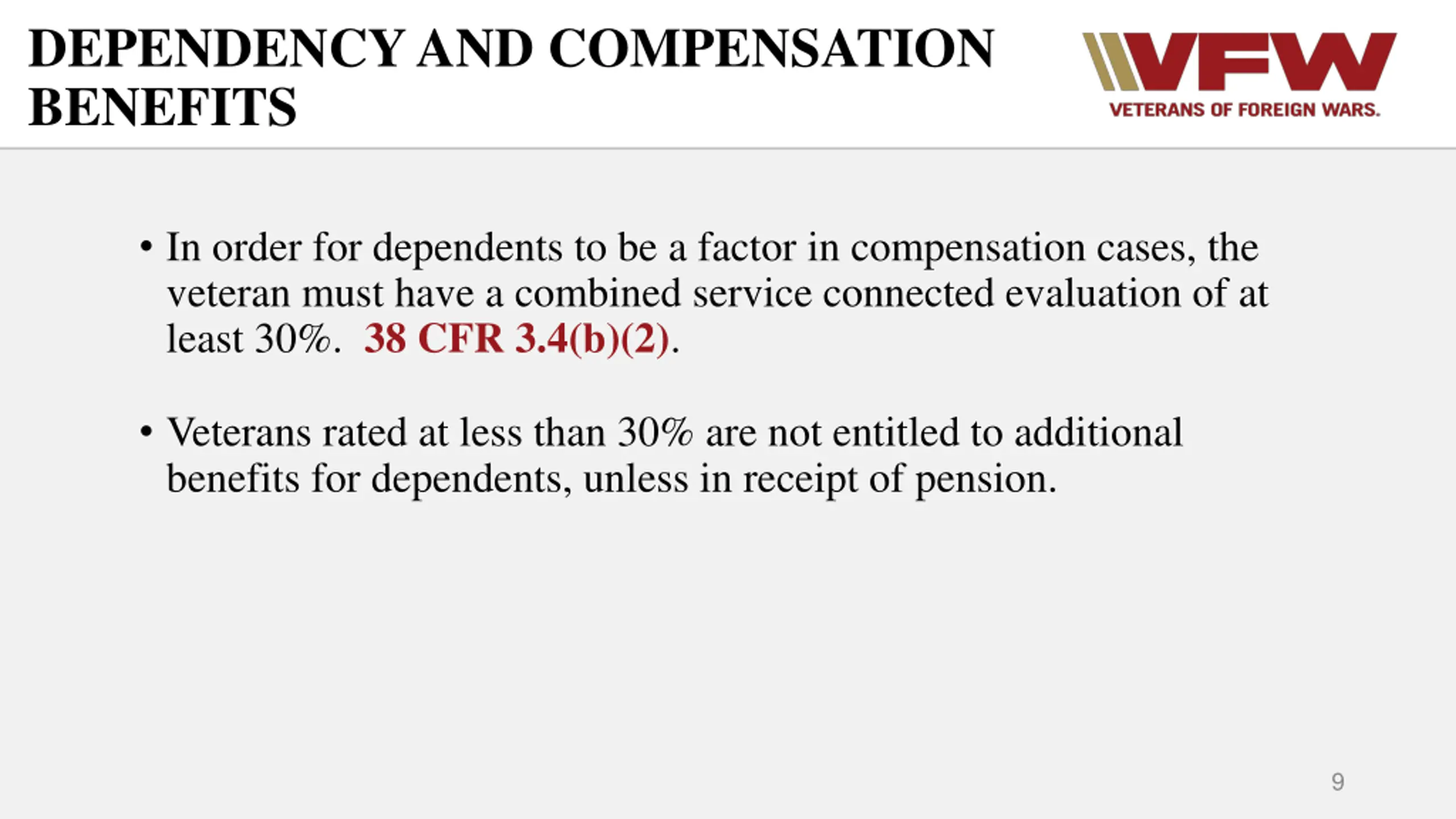 DEPENDENCY AND COMPENSATION BENEFITS In order for dependents to be a factor in compensation cases, the veteran must have a combined service connected evaluation of at least 30%. 38 CFR 3.4(b)(2). Veterans rated at less than 30% are not entitled to additional benefits for dependents, unless in receipt of pension. 9