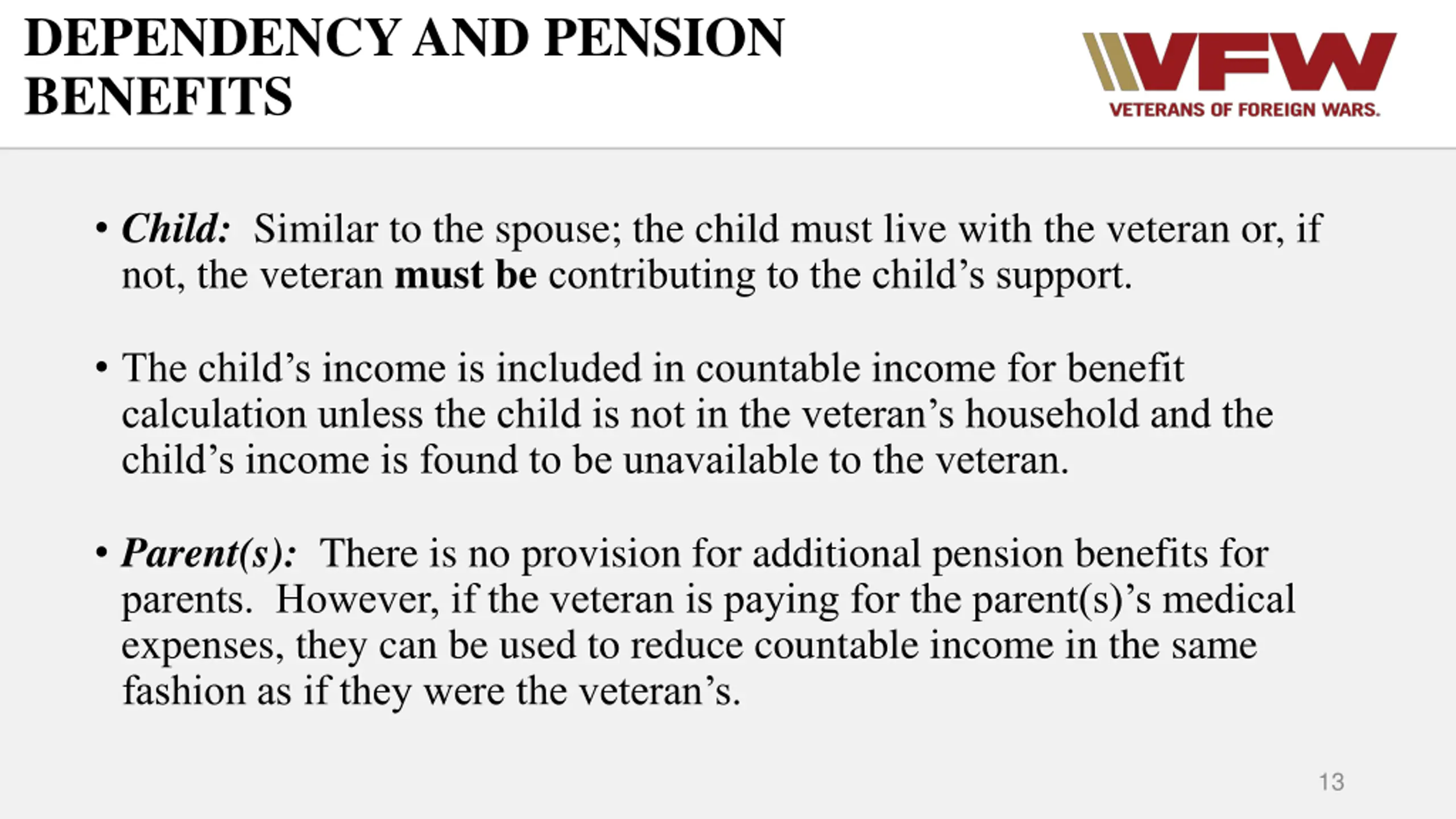 DEPENDENCY AND PENSION BENEFITS Child: Similar to the spouse; the child must live with the veteran or, if not, the veteran must becontributing to the child s support. The child s income is included in countable income for benefit calculation unless the child is not in the veteran s household and the child s income is found to be unavailable to the veteran. Parent(s): There is no provision for additional pension benefits for parents. However, if the veteran is paying for the parent(s) s medical expenses, they can be used to reduce countable income in the same fashion as if they were the veteran s. 13