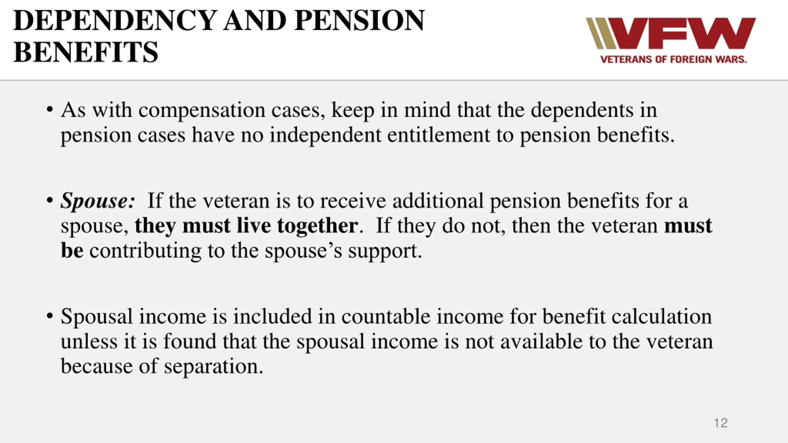 DEPENDENCY AND PENSION BENEFITS As with compensation cases, keep in mind that the dependents in pension cases have no independent entitlement to pension benefits. Spouse: If the veteran is to receive additional pension benefits for a spouse, they must live together. If they do not, then the veteran must becontributing to the spouse s support. Spousal income is included in countable income for benefit calculation unless it is found that the spousal income is not available to the veteran because of separation. 12