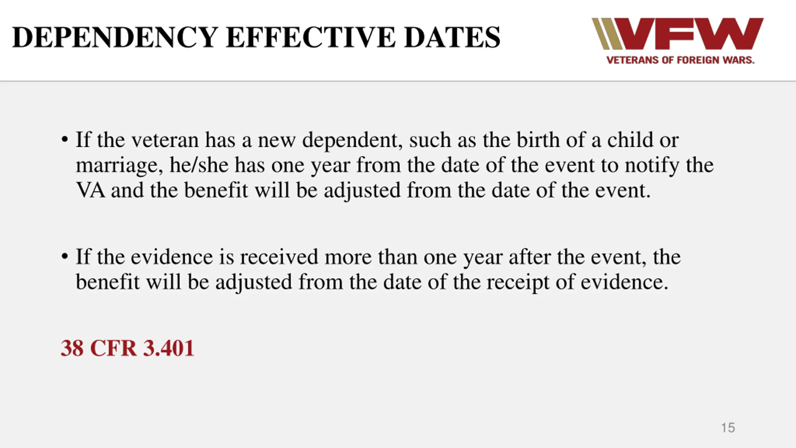 DEPENDENCY EFFECTIVE DATES If the veteran has a new dependent, such as the birth of a child or marriage, he/she has one year from the date of the event to notify the VA and the benefit will be adjusted from the date of the event. If the evidence is received more than one year after the event, the benefit will be adjusted from the date of the receipt of evidence. 38 CFR 3.401 15