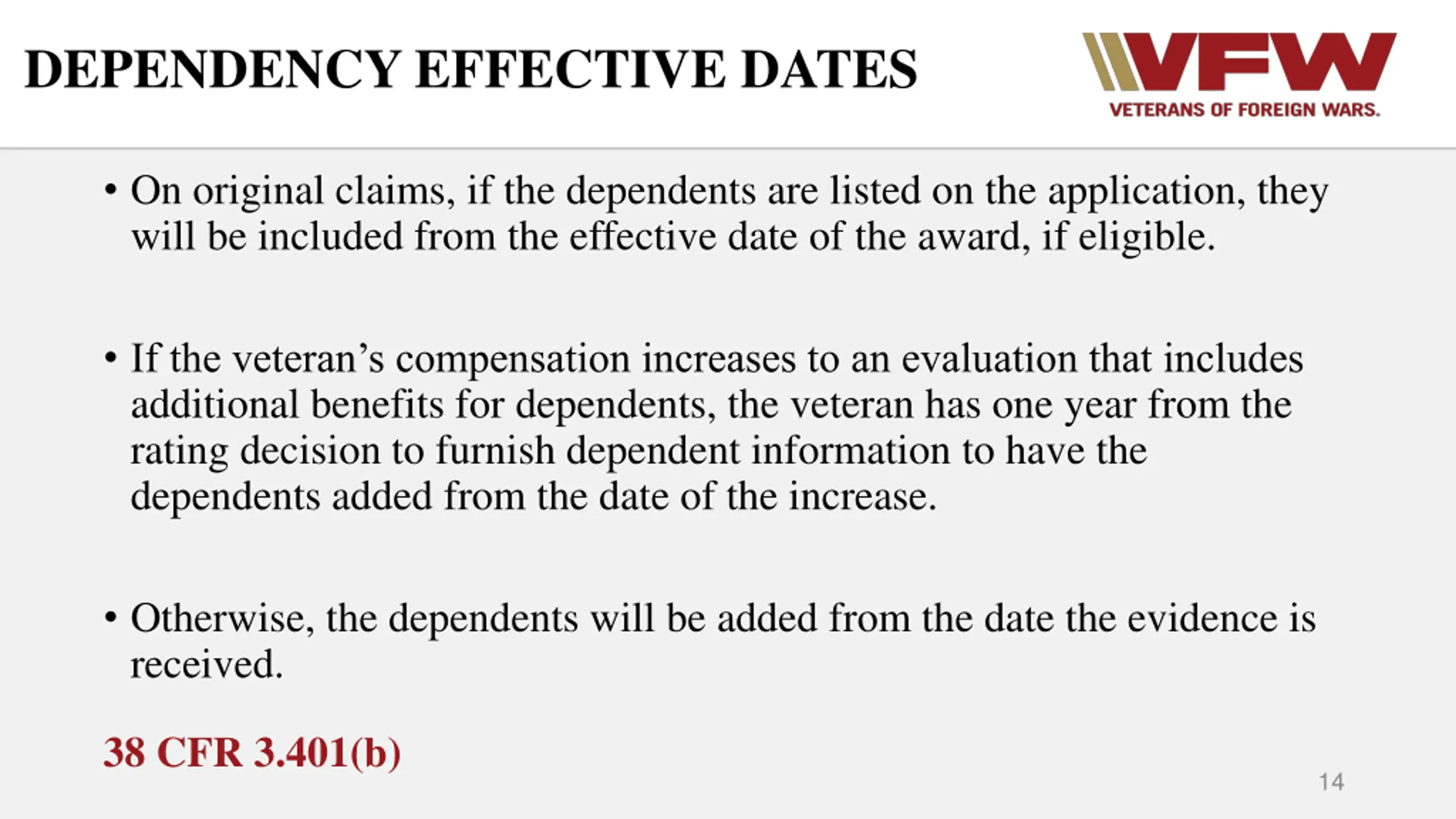 DEPENDENCY EFFECTIVE DATES On original claims, if the dependents are listed on the application, they will be included from the effective date of the award, if eligible. If the veteran s compensation increases to an evaluation that includes additional benefits for dependents, the veteran has one year from the rating decision to furnish dependent information to have the dependents added from the date of the increase. Otherwise, the dependents will be added from the date the evidence is received. 38 CFR 3.401(b) 14