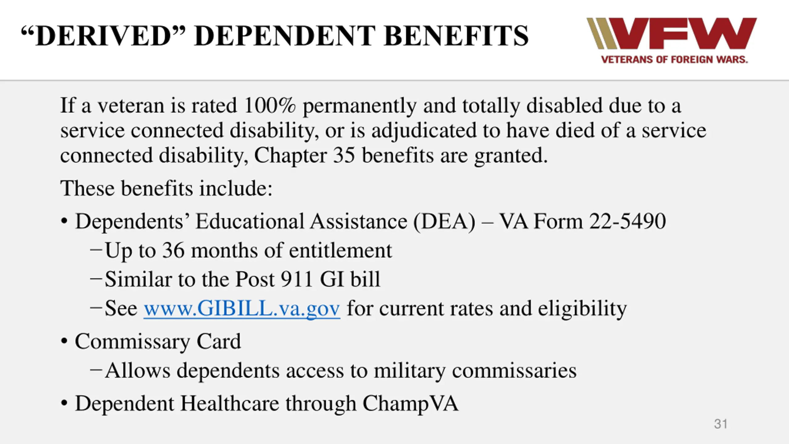 DERIVED DEPENDENT BENEFITS If a veteran is rated 100% permanently and totally disabled due to a service connected disability, or is adjudicated to have died of a service connected disability, Chapter 35 benefits are granted. These benefits include: Dependents Educational Assistance (DEA) VA Form 22-5490 Up to 36 months of entitlement Similar to the Post 911 GI bill See www.GIBILL.va.gov for current rates and eligibility Commissary Card Allows dependents access to military commissaries Dependent Healthcare through ChampVA 31