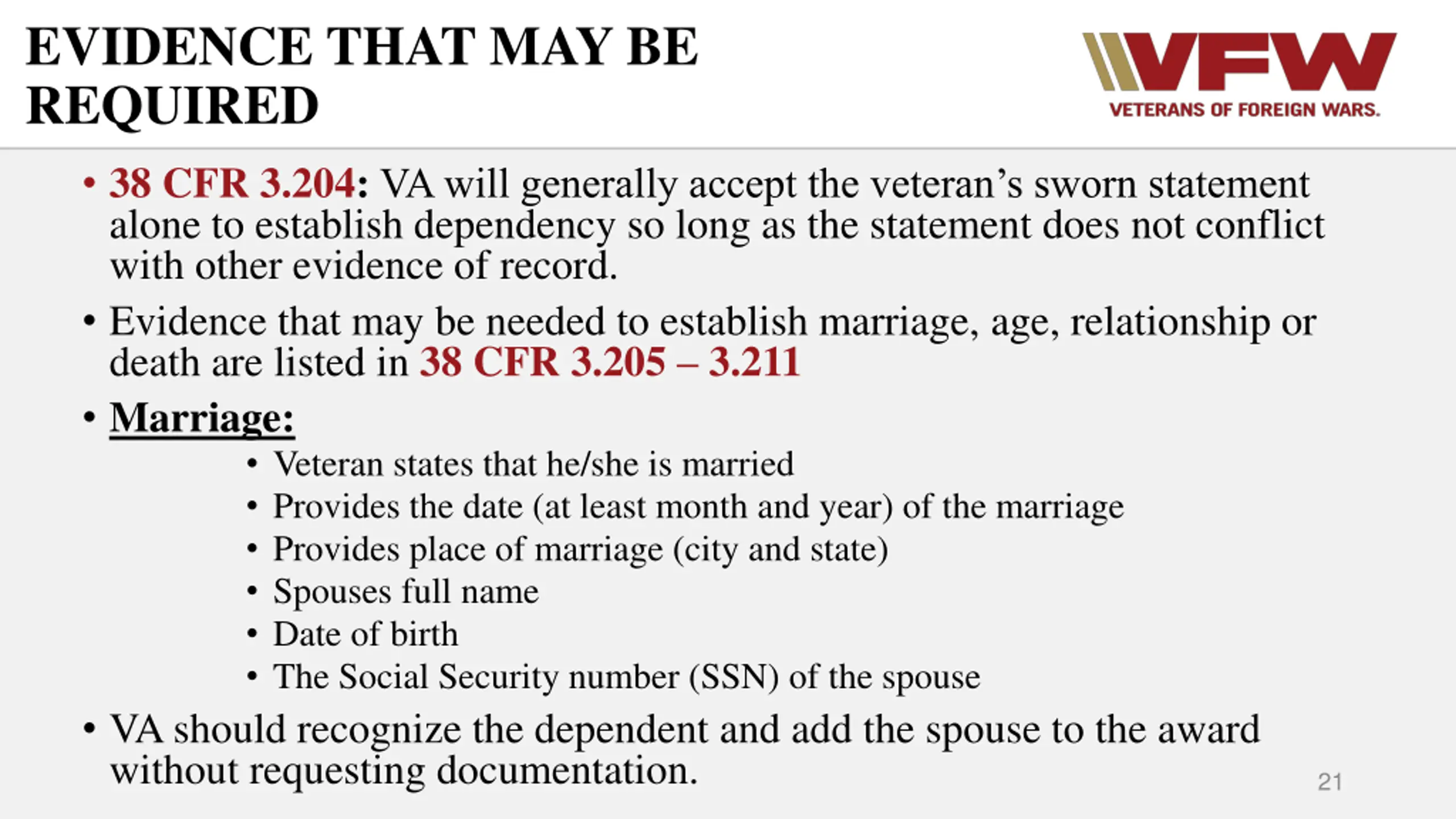 EVIDENCE THAT MAY BE REQUIRED 38 CFR 3.204:VA will generally accept the veteran s sworn statement alone to establish dependency so long as the statement does not conflict with other evidence of record. Evidence that may be needed to establish marriage, age, relationship or death are listed in 38 CFR 3.205 3.211 Marriage: Veteran states that he/she is married Provides the date (at least month and year) of the marriage Provides place of marriage (city and state) Spouses full name Date of birth The Social Security number (SSN) of the spouse VA should recognize the dependent and add the spouse to the award without requesting documentation. 21