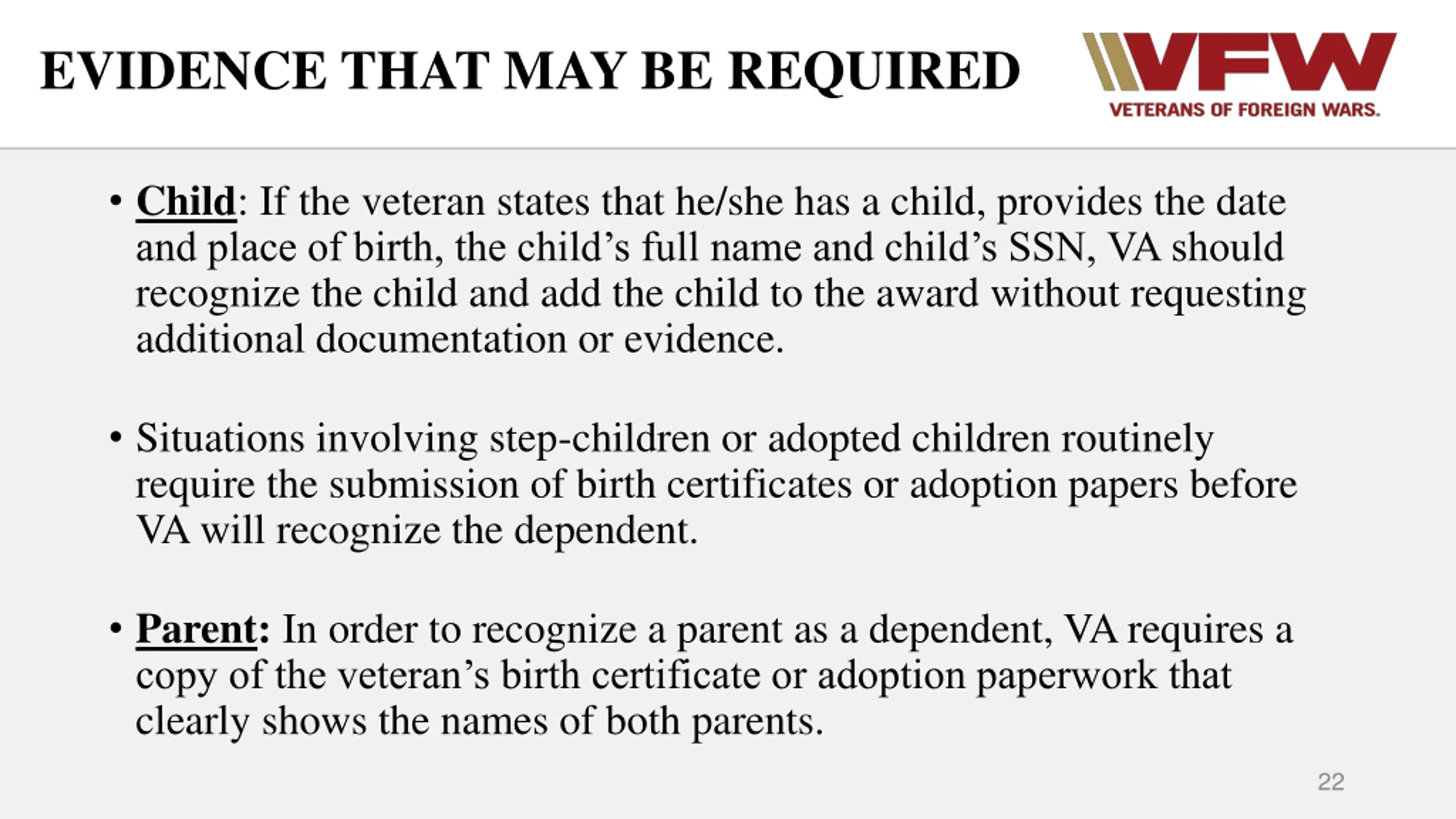 EVIDENCE THAT MAY BE REQUIRED Child: If the veteran states that he/she has a child, provides the date and place of birth, the child s full name and child s SSN, VA should recognize the child and add the child to the award without requesting additional documentation or evidence. Situations involving step-children or adopted children routinely require the submission of birth certificates or adoption papers before VA will recognize the dependent. Parent: In order to recognize a parent as a dependent, VA requires a copy of the veteran s birth certificate or adoption paperwork that clearly shows the names of both parents. 22