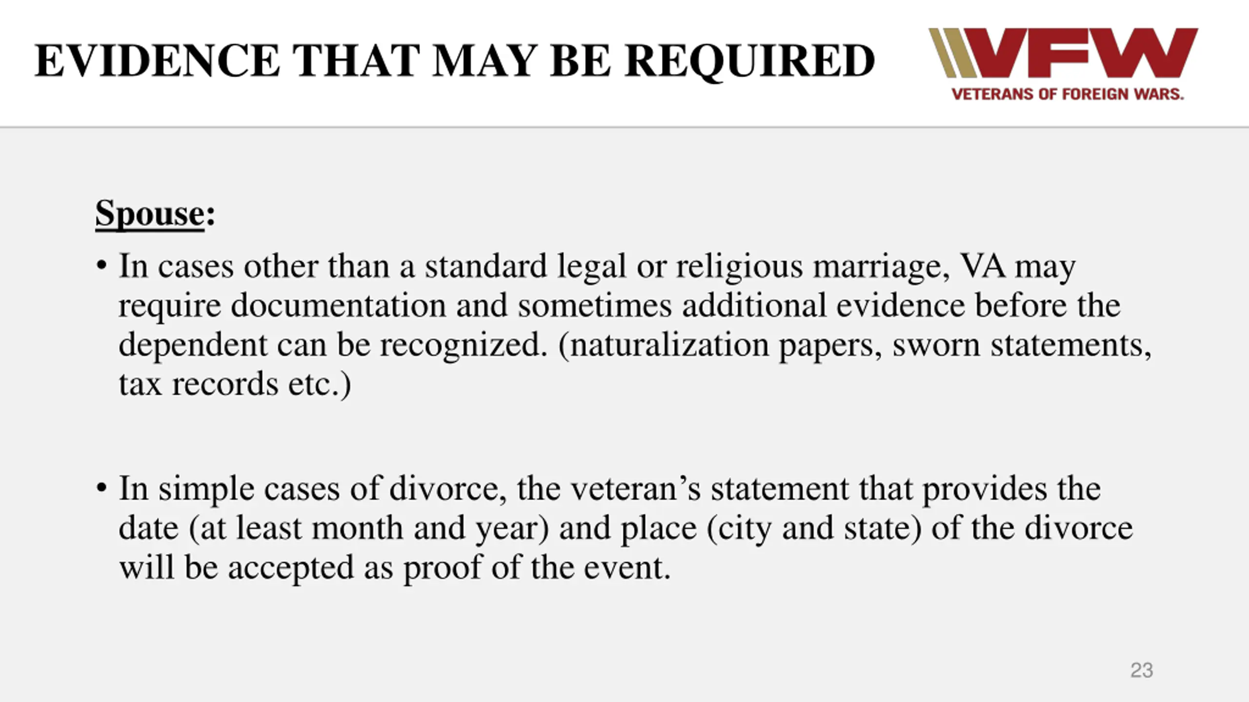 EVIDENCE THAT MAY BE REQUIRED Spouse: In cases other than a standard legal or religious marriage, VA may require documentation and sometimes additional evidence before the dependent can be recognized. (naturalization papers, sworn statements, tax records etc.) In simple cases of divorce, the veteran s statement that provides the date (at least month and year) and place (city and state) of the divorce will be accepted as proof of the event. 23