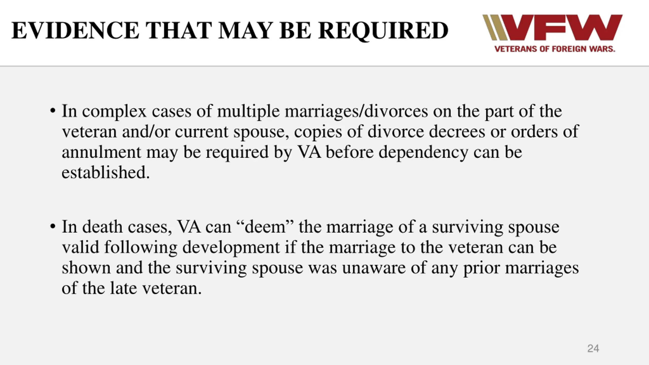 EVIDENCE THAT MAY BE REQUIRED In complex cases of multiple marriages/divorces on the part of the veteran and/or current spouse, copies of divorce decrees or orders of annulment may be required by VA before dependency can be established. In death cases, VA can deem the marriage of a surviving spouse valid following development if the marriage to the veteran can be shown and the surviving spouse was unaware of any prior marriages of the late veteran. 24
