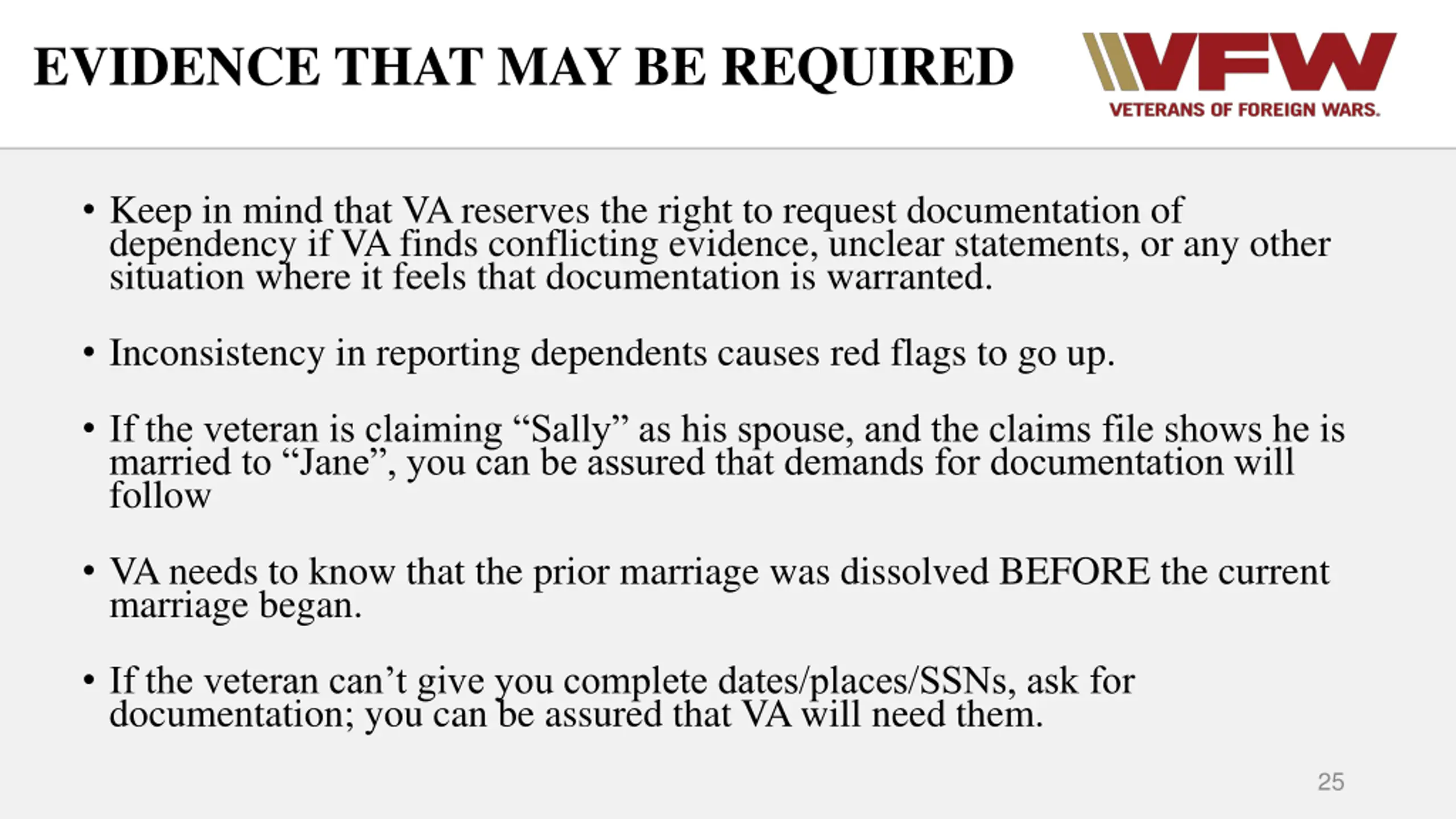 EVIDENCE THAT MAY BE REQUIRED Keep in mind that VA reserves the right to request documentation of dependency if VA finds conflicting evidence, unclear statements, or any other situation where it feels that documentation is warranted. Inconsistency in reporting dependents causes red flags to go up. If the veteran is claiming Sally as his spouse, and the claims file shows he is married to Jane , you can be assured that demands for documentation will follow VA needs to know that the prior marriage was dissolved BEFORE the current marriage began. If the veteran can t give you complete dates/places/SSNs, ask for documentation; you can be assured that VA will need them. 25