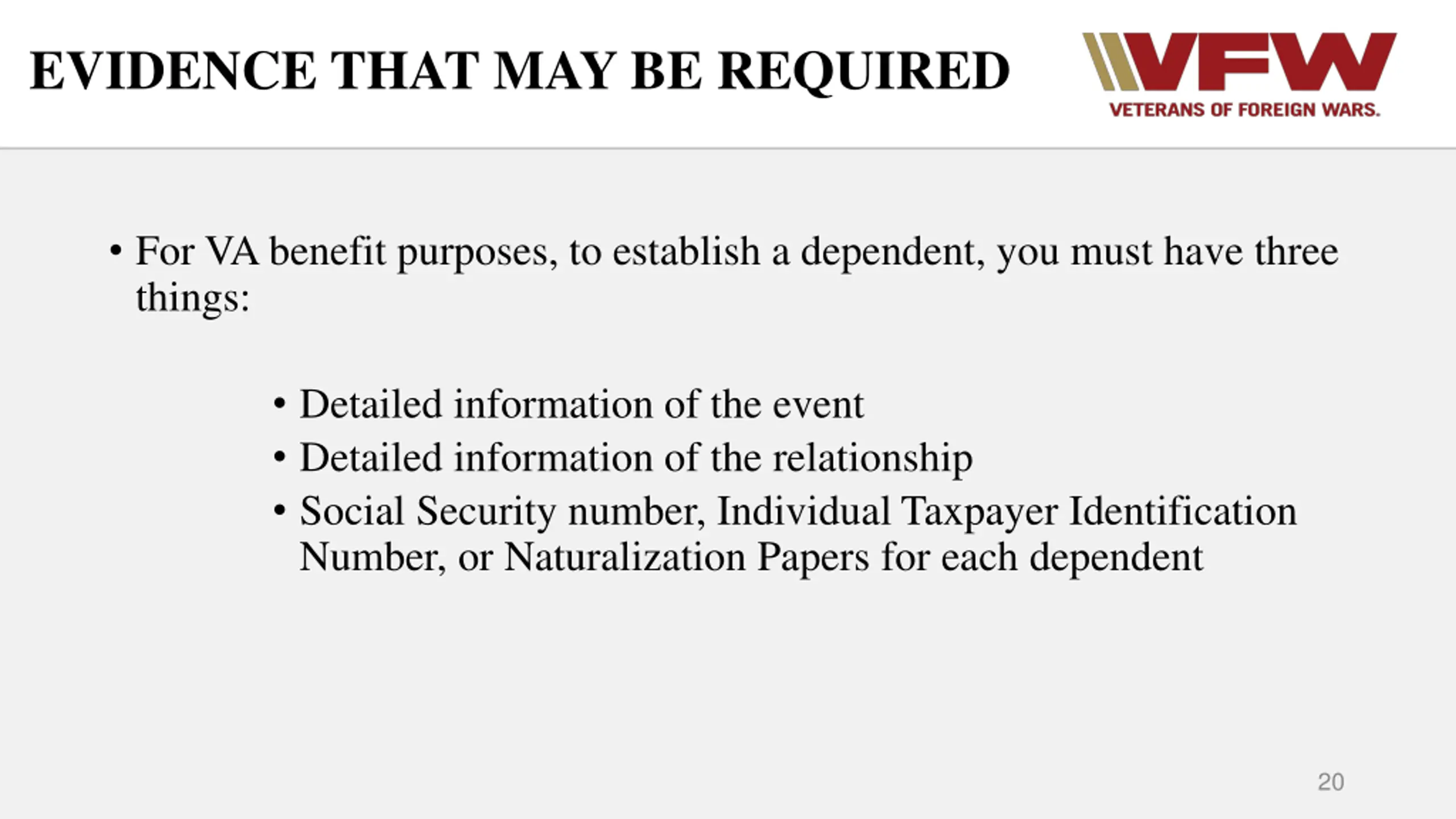 EVIDENCE THAT MAY BE REQUIRED For VA benefit purposes, to establish a dependent, you must have three things: Detailed information of the event Detailed information of the relationship Social Security number, Individual Taxpayer Identification Number, or Naturalization Papers for each dependent 20
