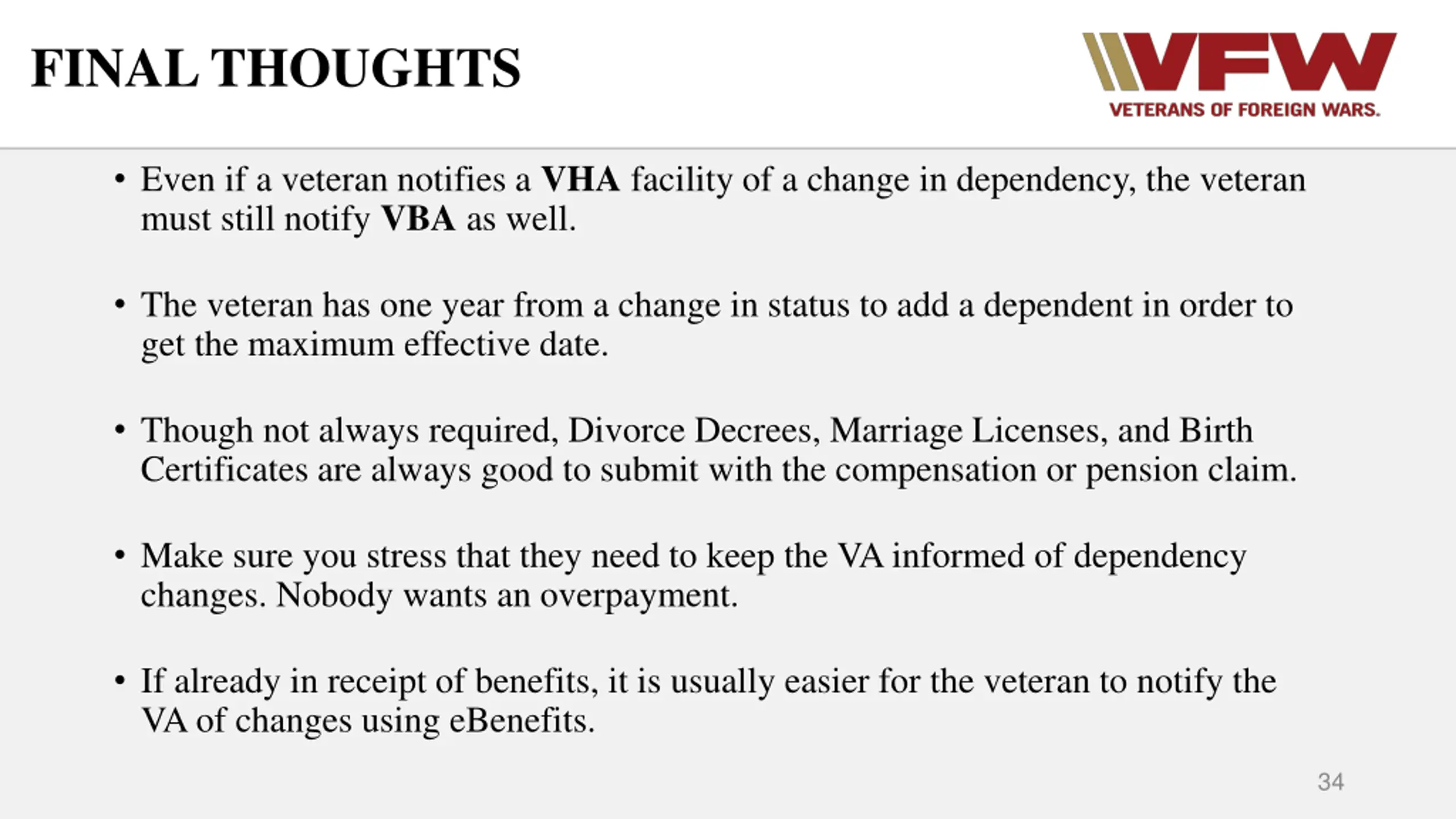 FINAL THOUGHTS Even if a veteran notifies a VHA facility of a change in dependency, the veteran must still notify VBA as well. The veteran has one year from a change in status to add a dependent in order to get the maximum effective date. Though not always required, Divorce Decrees, Marriage Licenses, and Birth Certificates are always good to submit with the compensation or pension claim. Make sure you stress that they need to keep the VA informed of dependency changes. Nobody wants an overpayment. If already in receipt of benefits, it is usually easier for the veteran to notify the VA of changes using eBenefits. 34