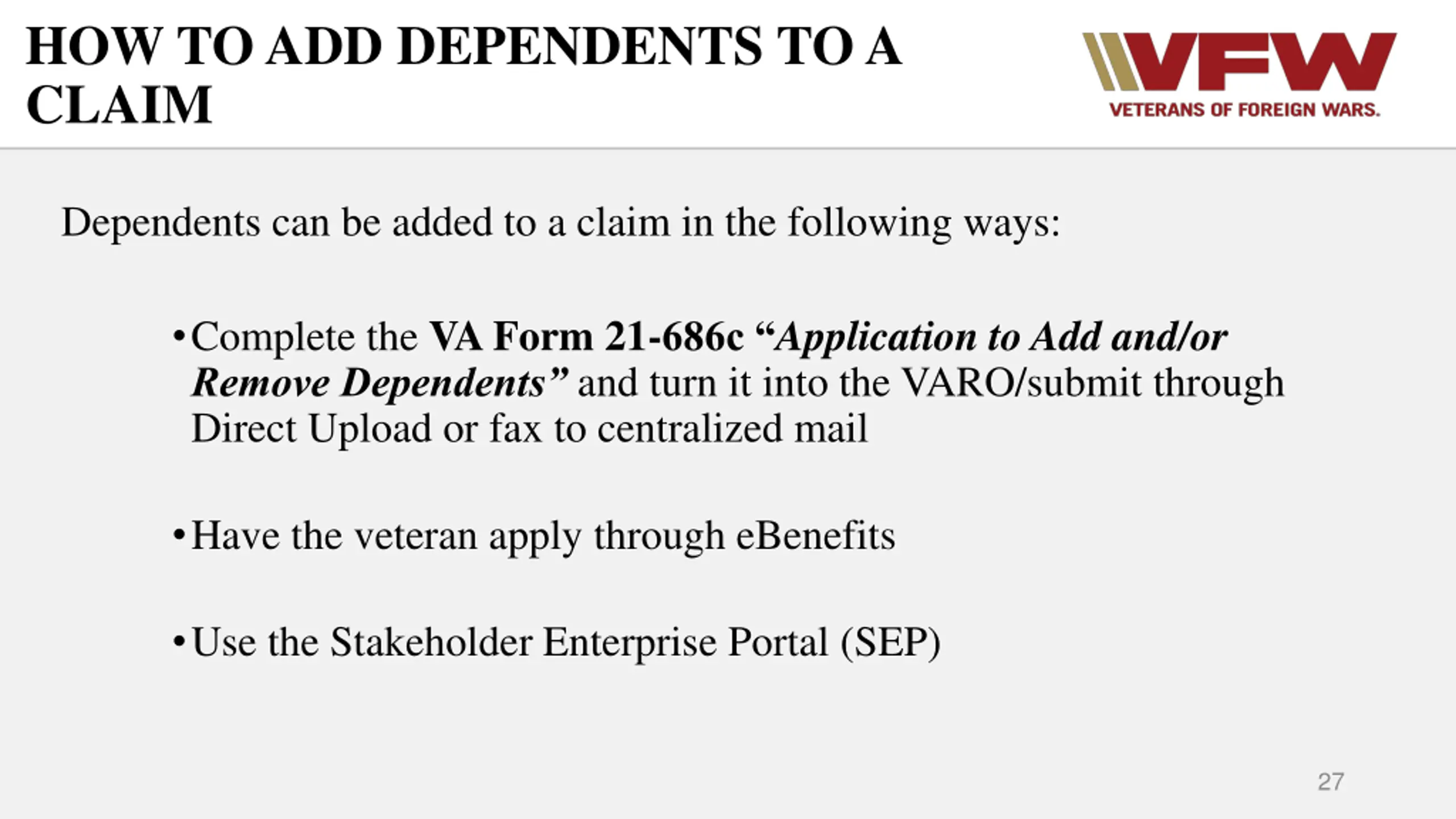 HOW TO ADD DEPENDENTS TO A CLAIM Dependents can be added to a claim in the following ways: Complete the VA Form 21-686c Application to Add and/or Remove Dependents and turn it into the VARO/submit through Direct Upload or fax to centralized mail Have the veteran apply through eBenefits Use the Stakeholder Enterprise Portal (SEP) 27