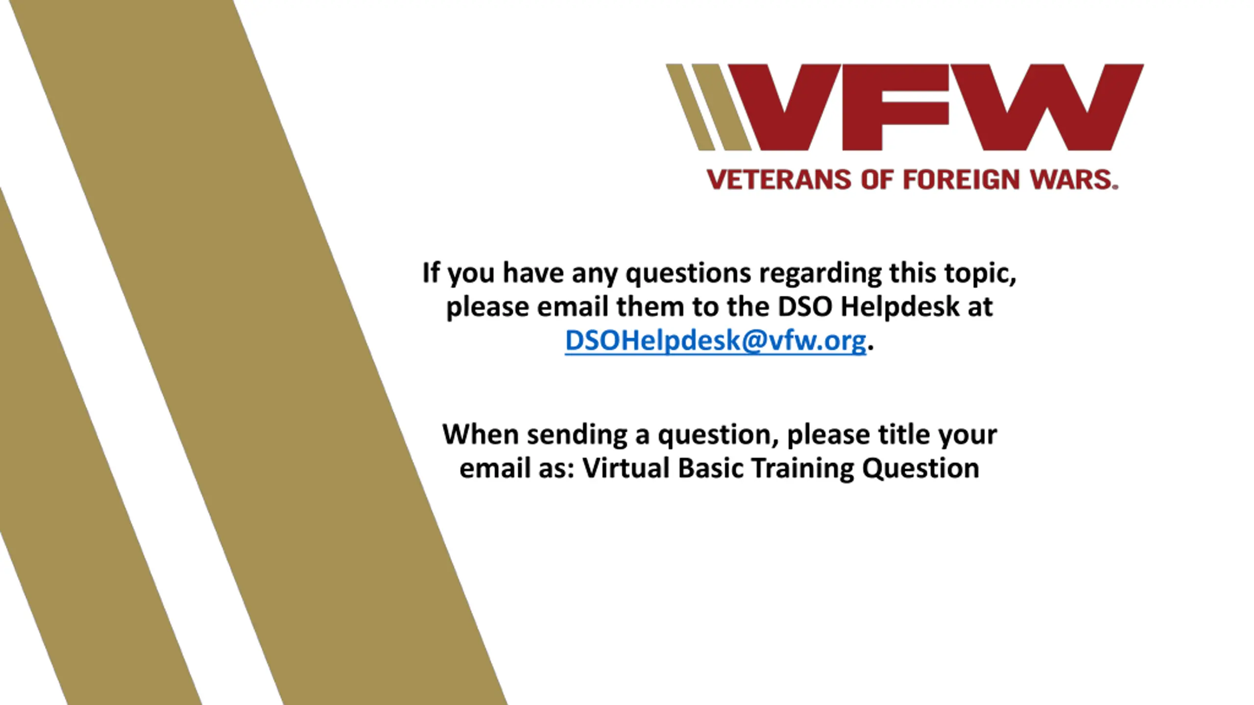 If you have any questions regarding this topic, please email them to the DSO Helpdesk at DSOHelpdesk@vfw.org. When sending a question, please title your email as: Virtual Basic Training Question