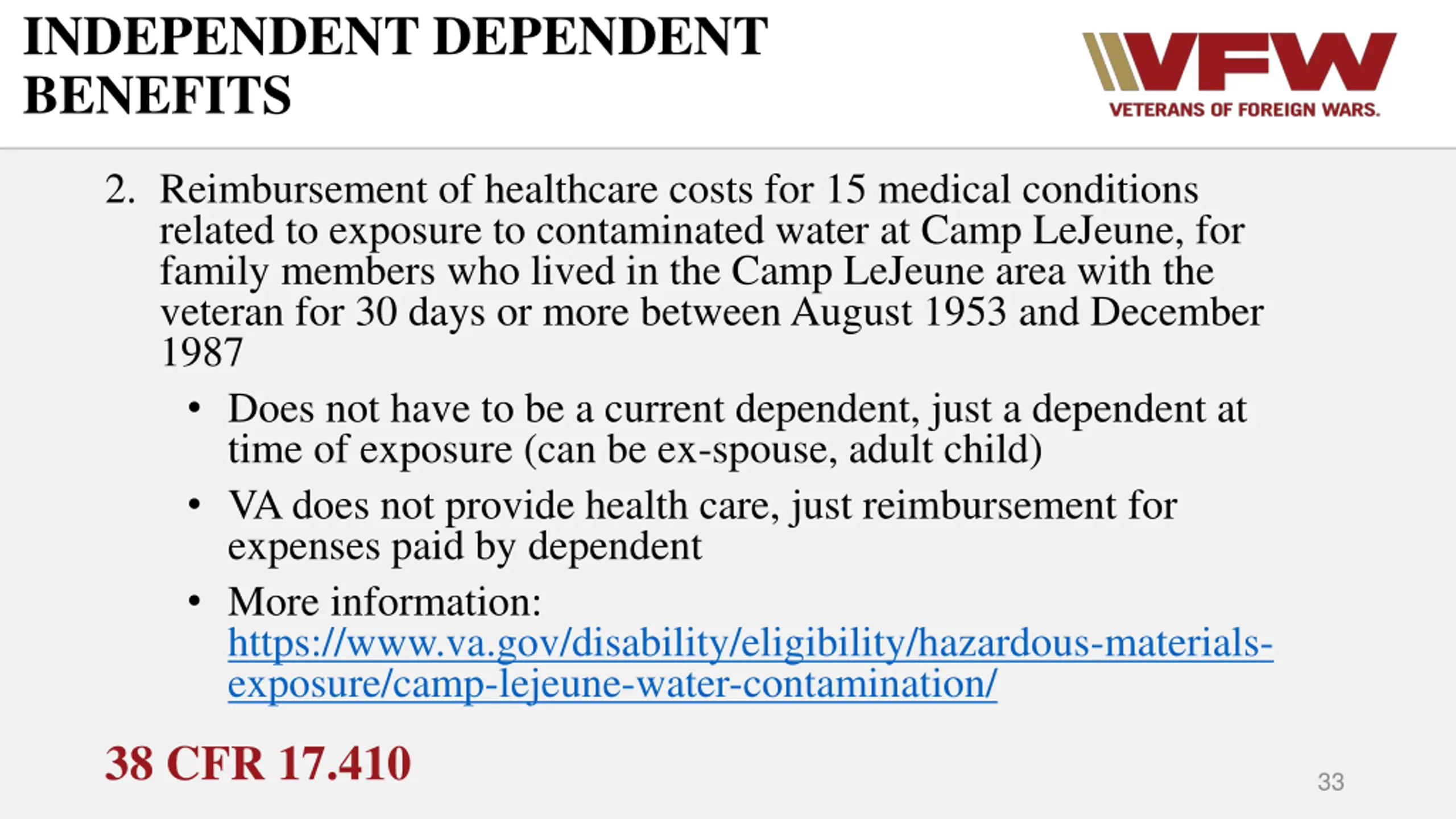 INDEPENDENT DEPENDENT BENEFITS 2. Reimbursement of healthcare costs for 15 medical conditions related to exposure to contaminated water at Camp LeJeune, for family members who lived in the Camp LeJeune area with the veteran for 30 days or more between August 1953 and December 1987 Does not have to be a current dependent, just a dependent at time of exposure (can be ex-spouse, adult child) VA does not provide health care, just reimbursement for expenses paid by dependent More information: https://www.va.gov/disability/eligibility/hazardous-materials- exposure/camp-lejeune-water-contamination/ 38 CFR 17.410 33