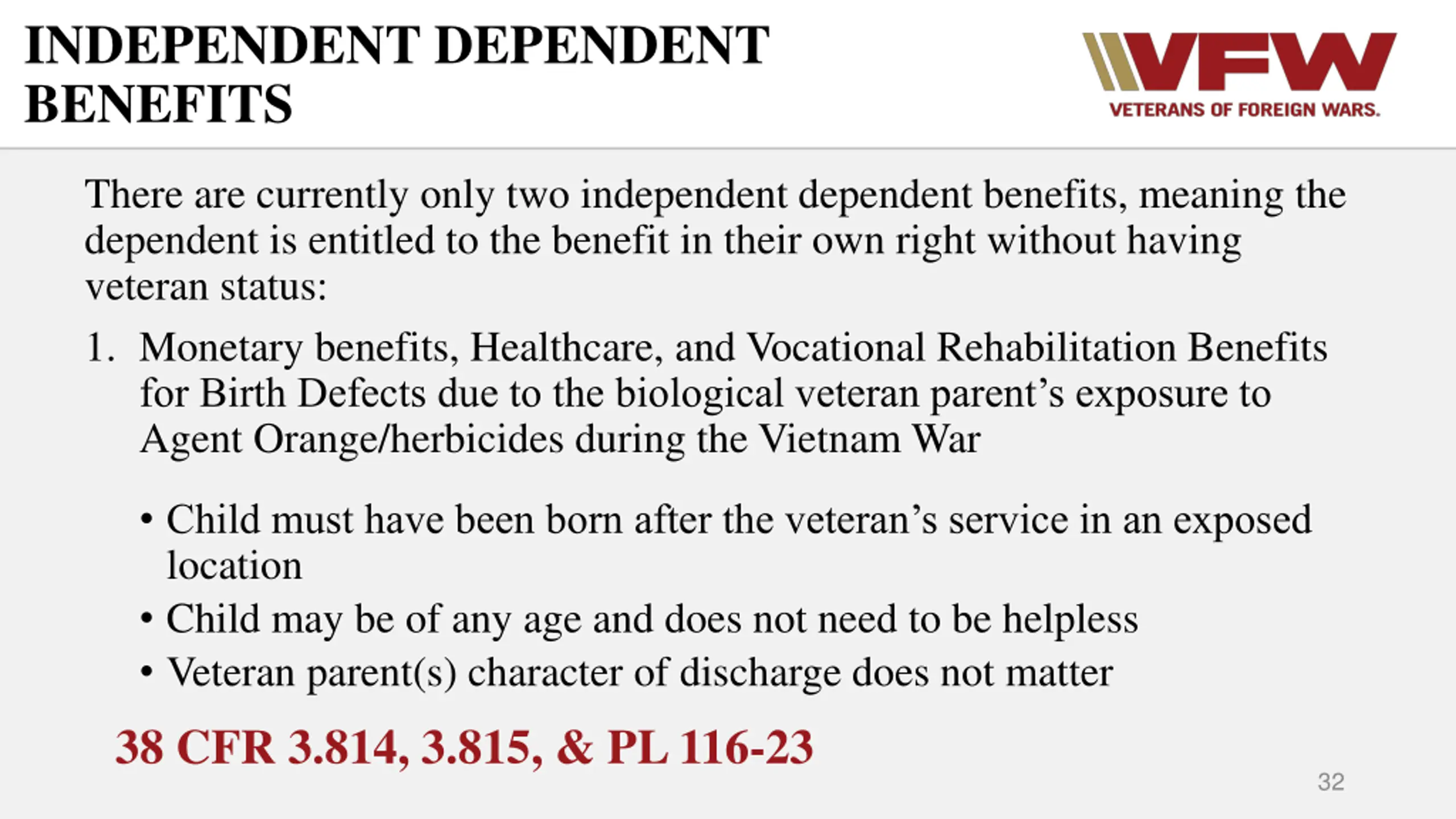 INDEPENDENT DEPENDENT BENEFITS There are currently only two independent dependent benefits, meaning the dependent is entitled to the benefit in their own right without having veteran status: 1. Monetary benefits, Healthcare, and Vocational Rehabilitation Benefits for Birth Defects due to the biological veteran parent s exposure to Agent Orange/herbicides during the Vietnam War Child must have been born after the veteran s service in an exposed location Child may be of any age and does not need to be helpless Veteran parent(s) character of discharge does not matter 38 CFR 3.814,3.815, & PL 116-23 32