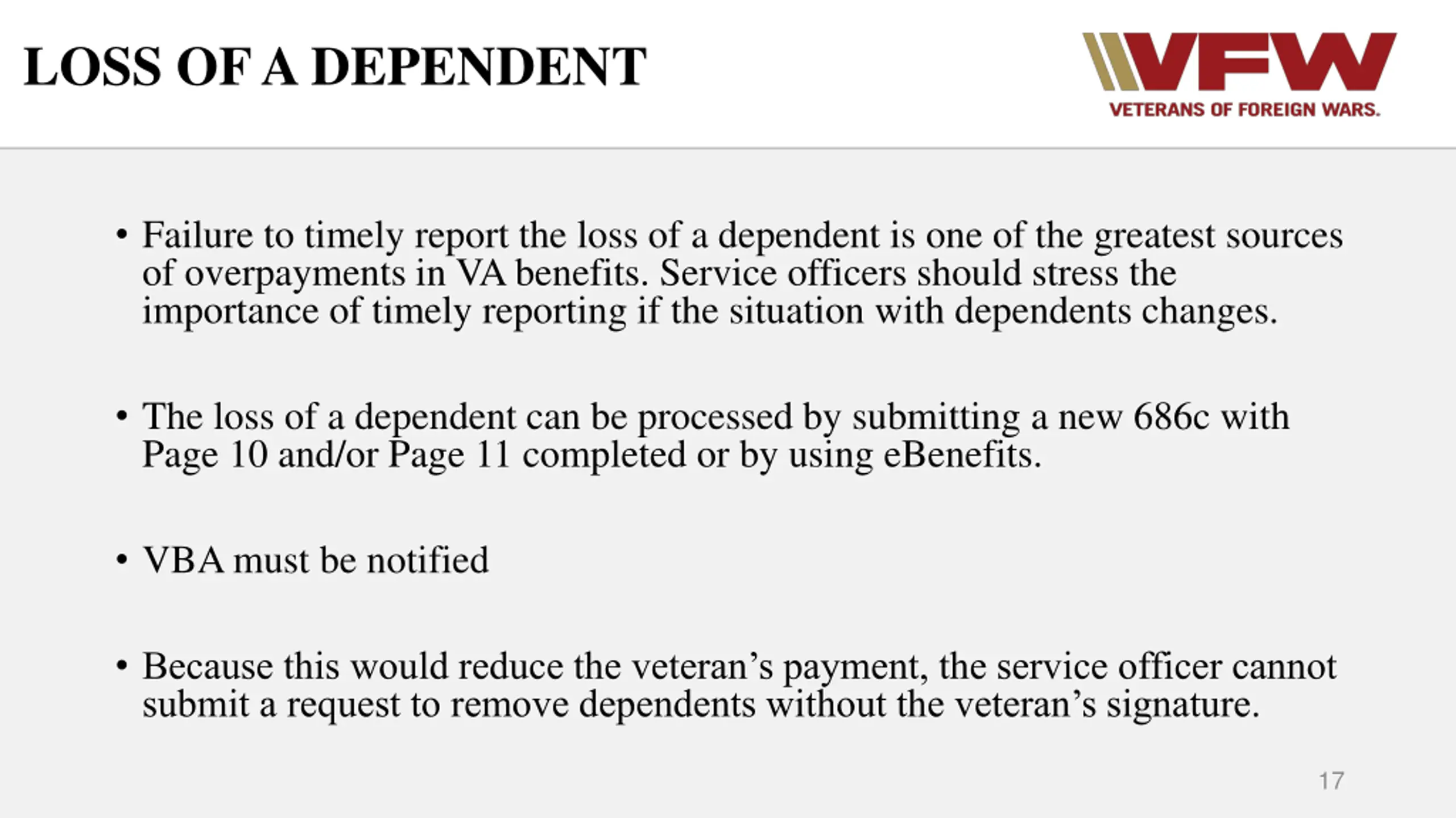 LOSS OF A DEPENDENT Failure to timely report the loss of a dependent is one of the greatest sources of overpayments in VA benefits. Service officers should stress the importance of timely reporting if the situation with dependents changes. The loss of a dependent can be processed by submitting a new 686c with Page 10 and/or Page 11 completed or by using eBenefits. VBA must be notified Because this would reduce the veteran s payment, the service officer cannot submit a request to remove dependents without the veteran s signature. 17