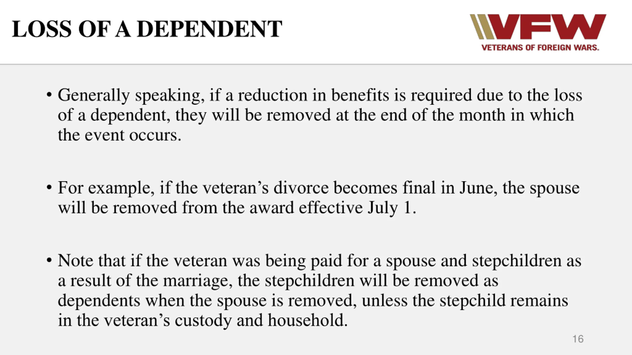 LOSS OF A DEPENDENT Generally speaking, if a reduction in benefits is required due to the loss of a dependent, they will be removed at the end of the month in which the event occurs. For example, if the veteran s divorce becomes final in June, the spouse will be removed from the award effective July 1. Note that if the veteran was being paid for a spouse and stepchildren as a result of the marriage, the stepchildren will be removed as dependents when the spouse is removed, unless the stepchild remains in the veteran s custody and household. 16