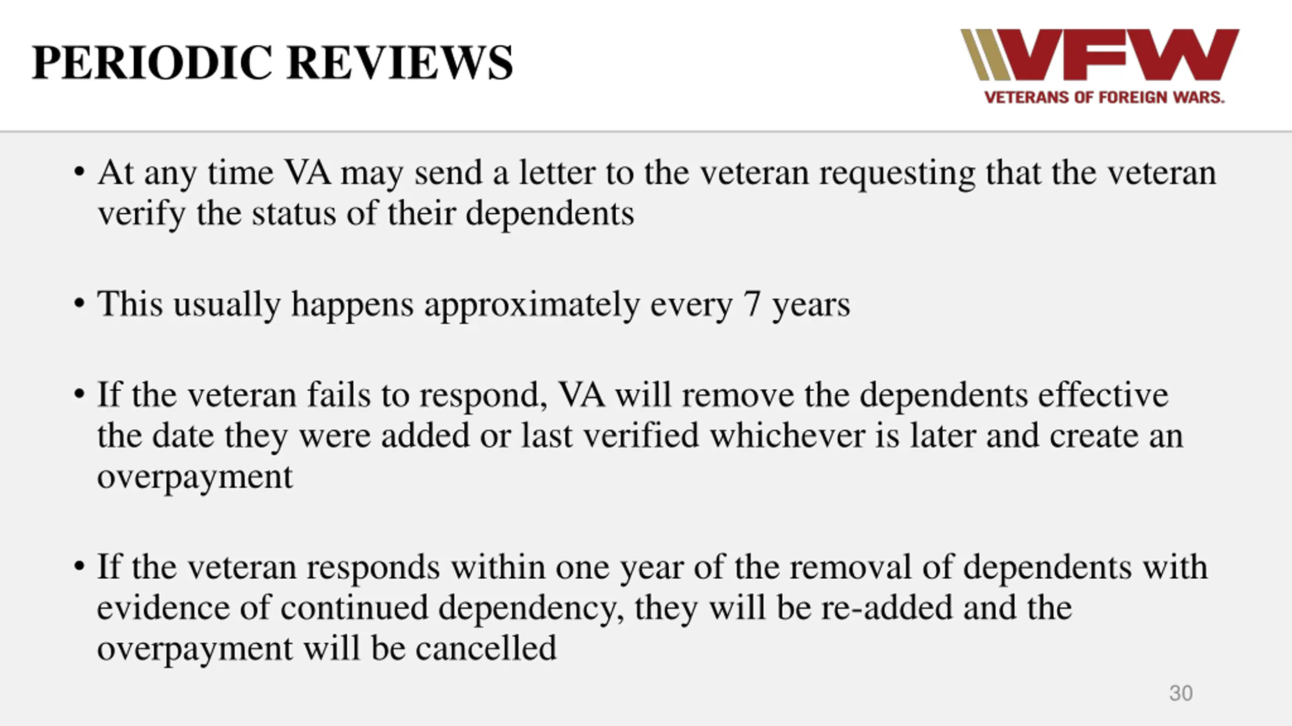 PERIODIC REVIEWS At any time VA may send a letter to the veteran requesting that the veteran verify the status of their dependents This usually happens approximately every 7 years If the veteran fails to respond, VA will remove the dependents effective the date they were added or last verified whichever is later and create an overpayment If the veteran responds within one year of the removal of dependents with evidence of continued dependency, they will be re-added and the overpayment will be cancelled 30