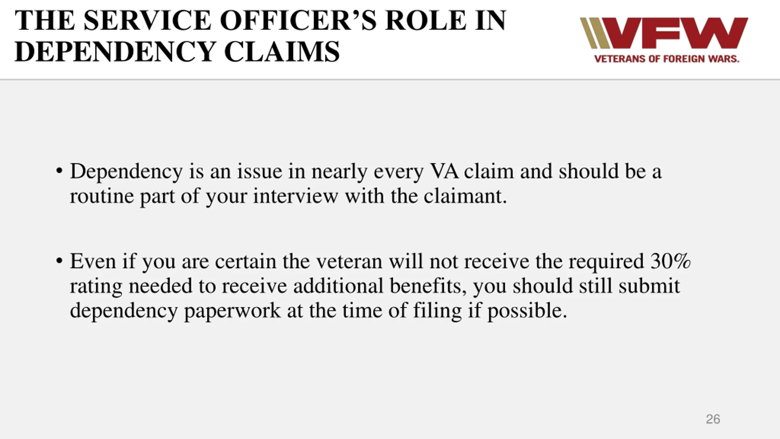THE SERVICE OFFICERS ROLE IN DEPENDENCY CLAIMS Dependency is an issue in nearly every VA claim and should be a routine part of your interview with the claimant. Even if you are certain the veteran will not receive the required 30% rating needed to receive additional benefits, you should still submit dependency paperwork at the time of filing if possible. 26
