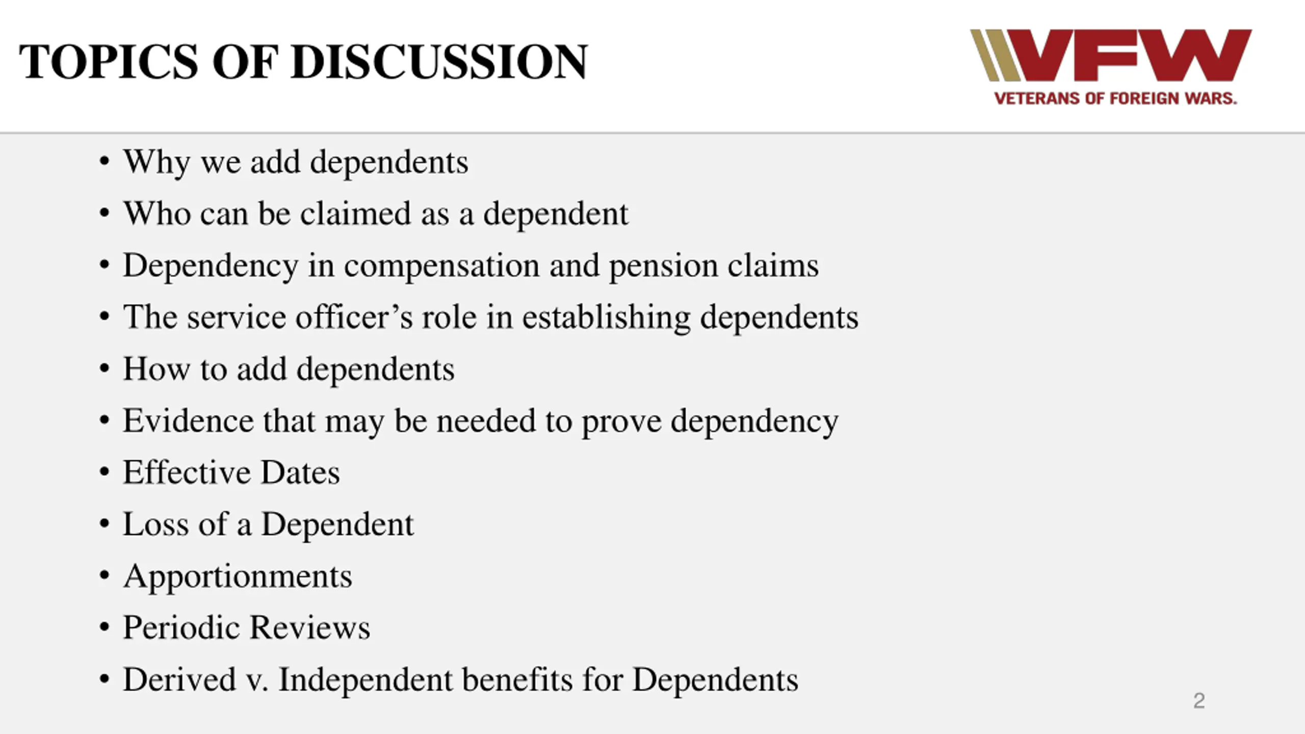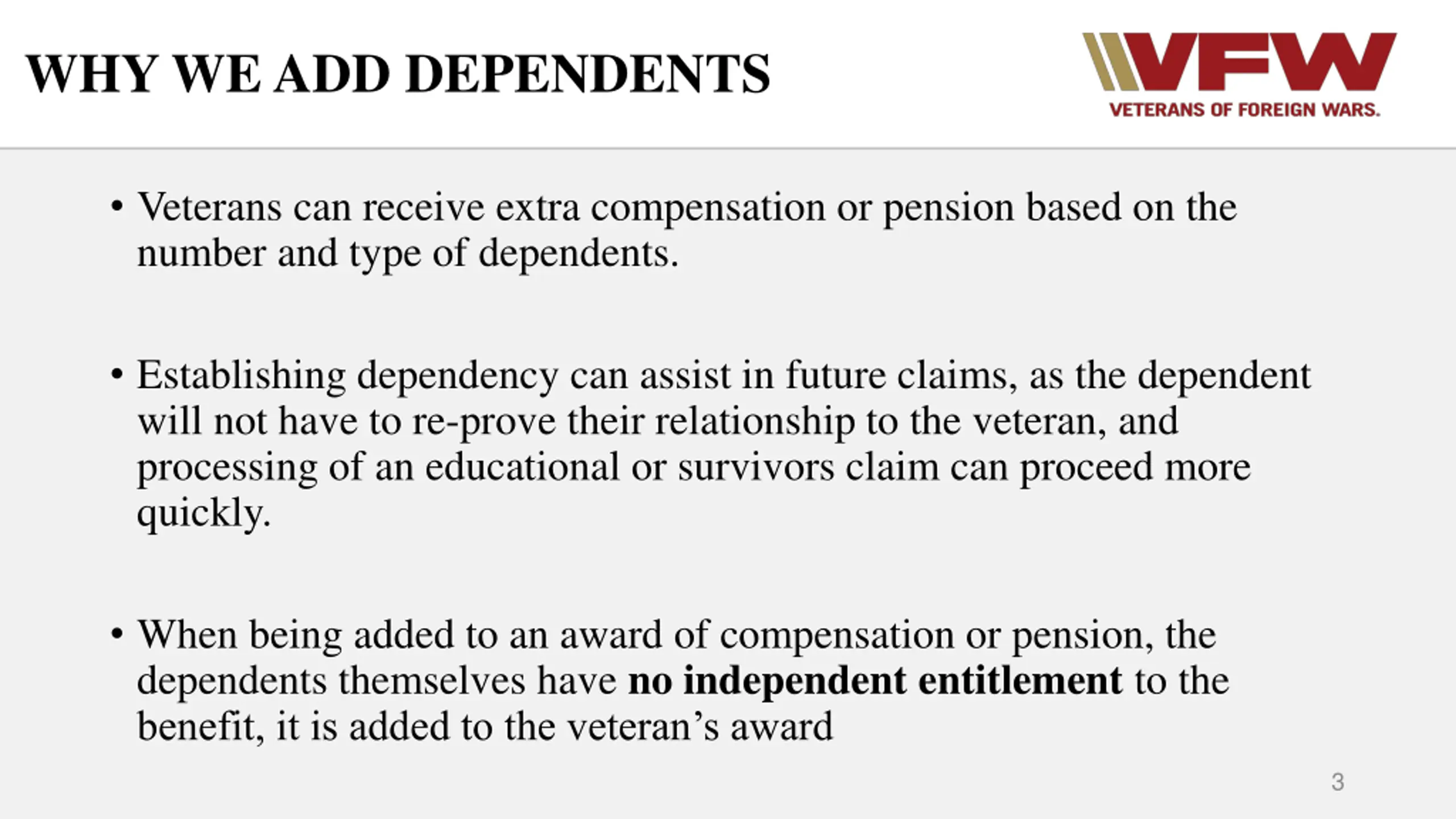 TOPICS OF DISCUSSION Why we add dependents Who can be claimed as a dependent Dependency in compensation and pension claims The service officer s role in establishing dependents How to add dependents Evidence that may be needed to prove dependency Effective Dates Loss of a Dependent Apportionments Periodic Reviews Derived v. Independent benefits for Dependents 2