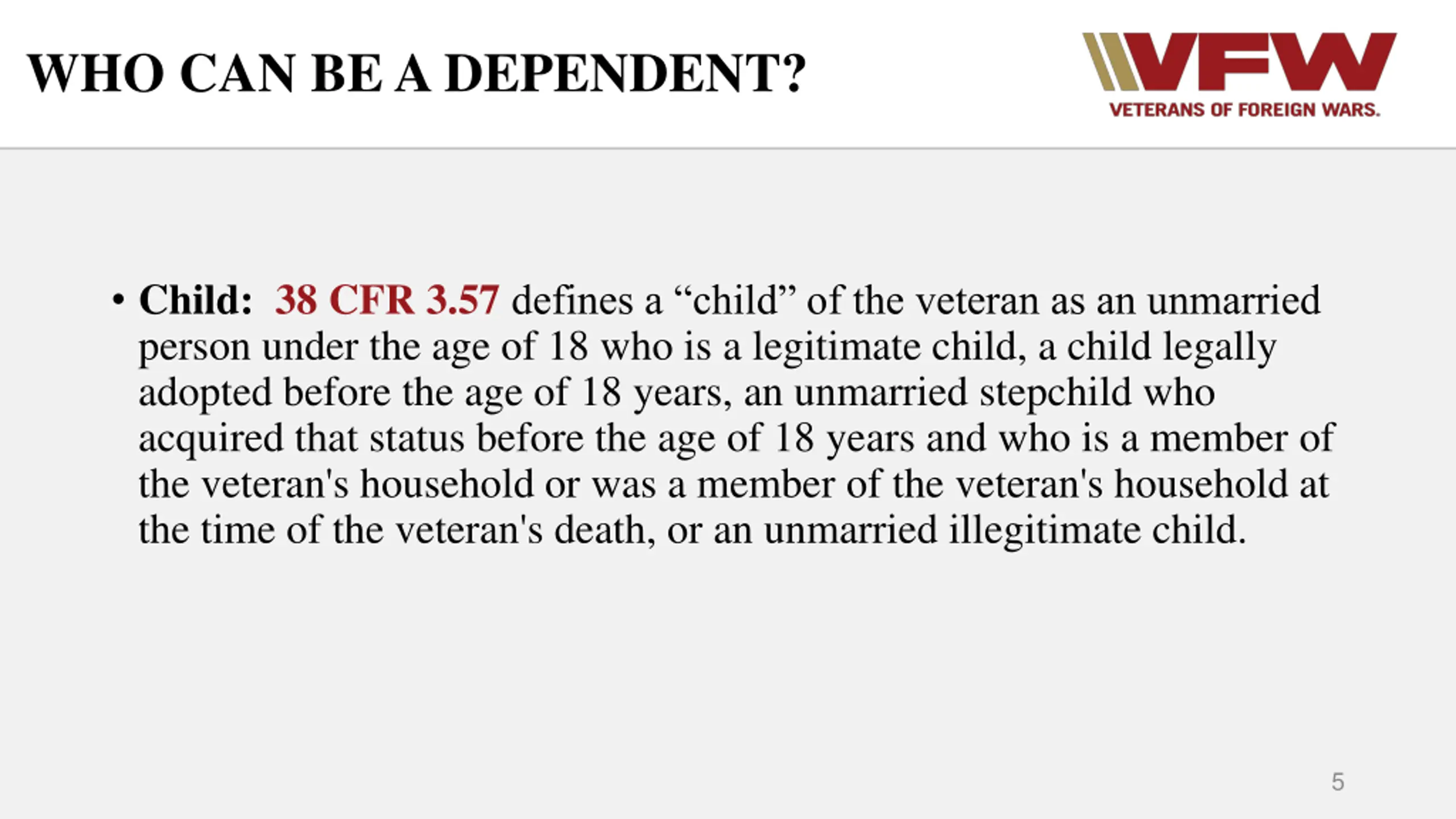 WHO CAN BE A DEPENDENT? Child: 38 CFR 3.57 defines a child of the veteran as an unmarried person under the age of 18 who is a legitimate child, a child legally adopted before the age of 18 years, an unmarried stepchild who acquired that status before the age of 18 years and who is a member of the veteran's household or was a member of the veteran's household at the time of the veteran's death, or an unmarried illegitimate child. 5