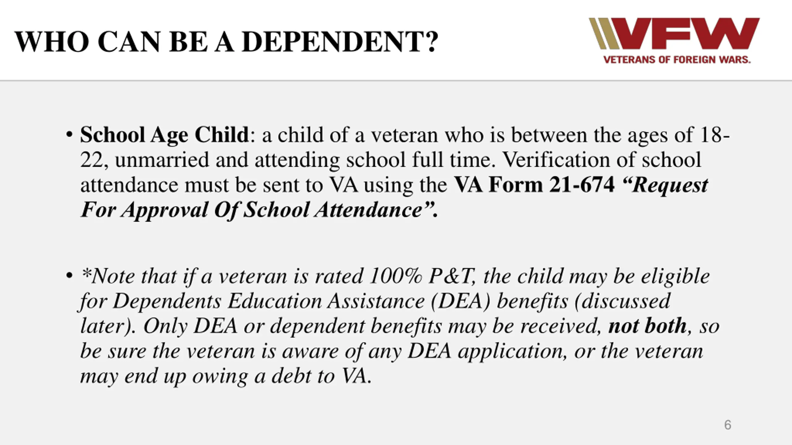 WHO CAN BE A DEPENDENT? School Age Child: a child of a veteran who is between the ages of 18- 22, unmarried and attending school full time. Verification of school attendance must be sent to VA using the VA Form 21-674 Request For Approval Of School Attendance . *Note that if a veteran is rated 100% P&T, the child may be eligible for Dependents Education Assistance (DEA) benefits (discussed later). Only DEA or dependent benefits may be received, not both, so be sure the veteran is aware of any DEA application, or the veteran may end up owing a debt to VA. 6