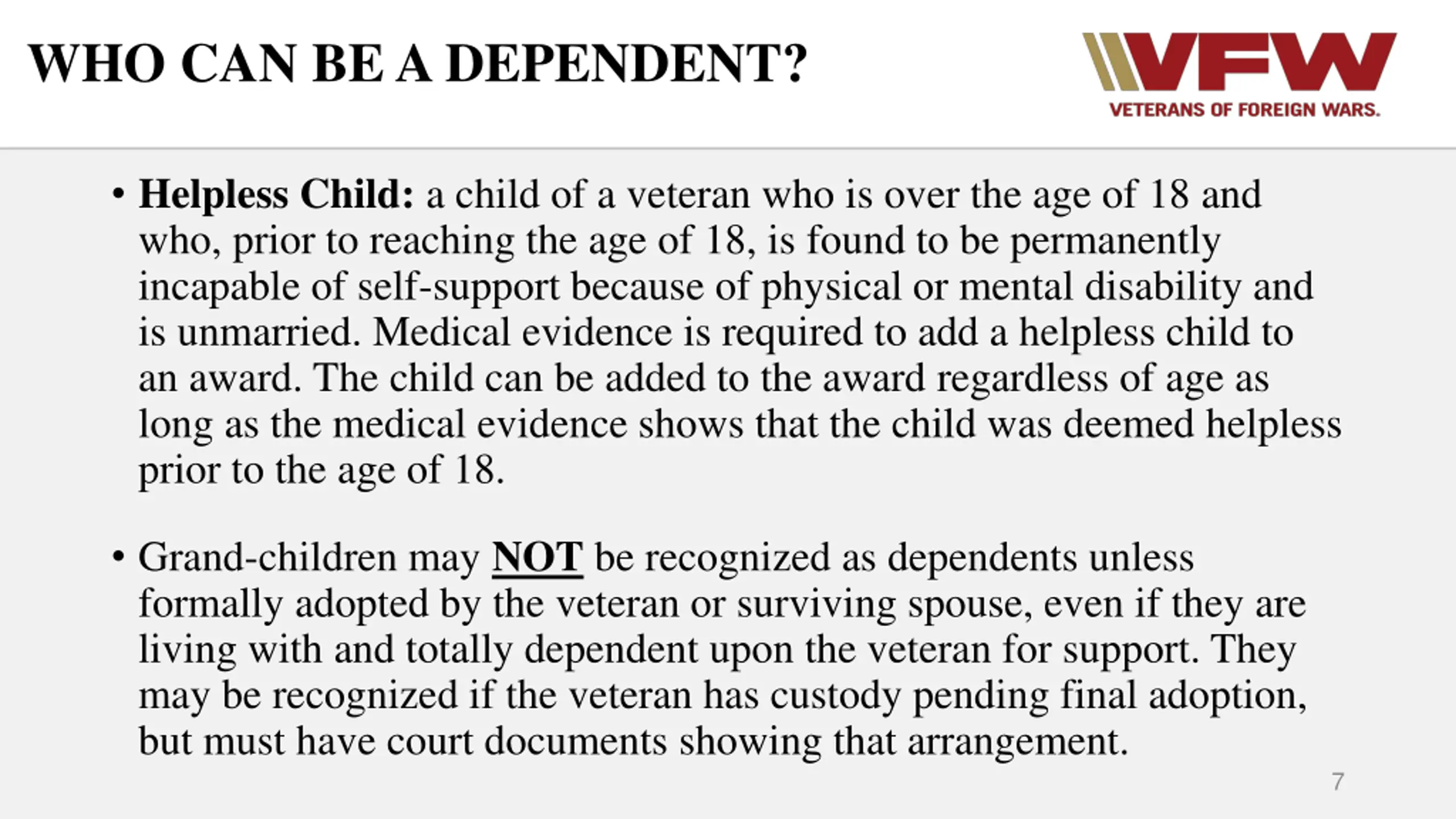 WHO CAN BE A DEPENDENT? Helpless Child: a child of a veteran who is over the age of 18 and who, prior to reaching the age of 18, is found to be permanently incapable of self-support because of physical or mental disability and is unmarried. Medical evidence is required to add a helpless child to an award. The child can be added to the award regardless of age as long as the medical evidence shows that the child was deemed helpless prior to the age of 18. Grand-children may NOT be recognized as dependents unless formally adopted by the veteran or surviving spouse, even if they are living with and totally dependent upon the veteran for support. They may be recognized if the veteran has custody pending final adoption, but must have court documents showing that arrangement. 7