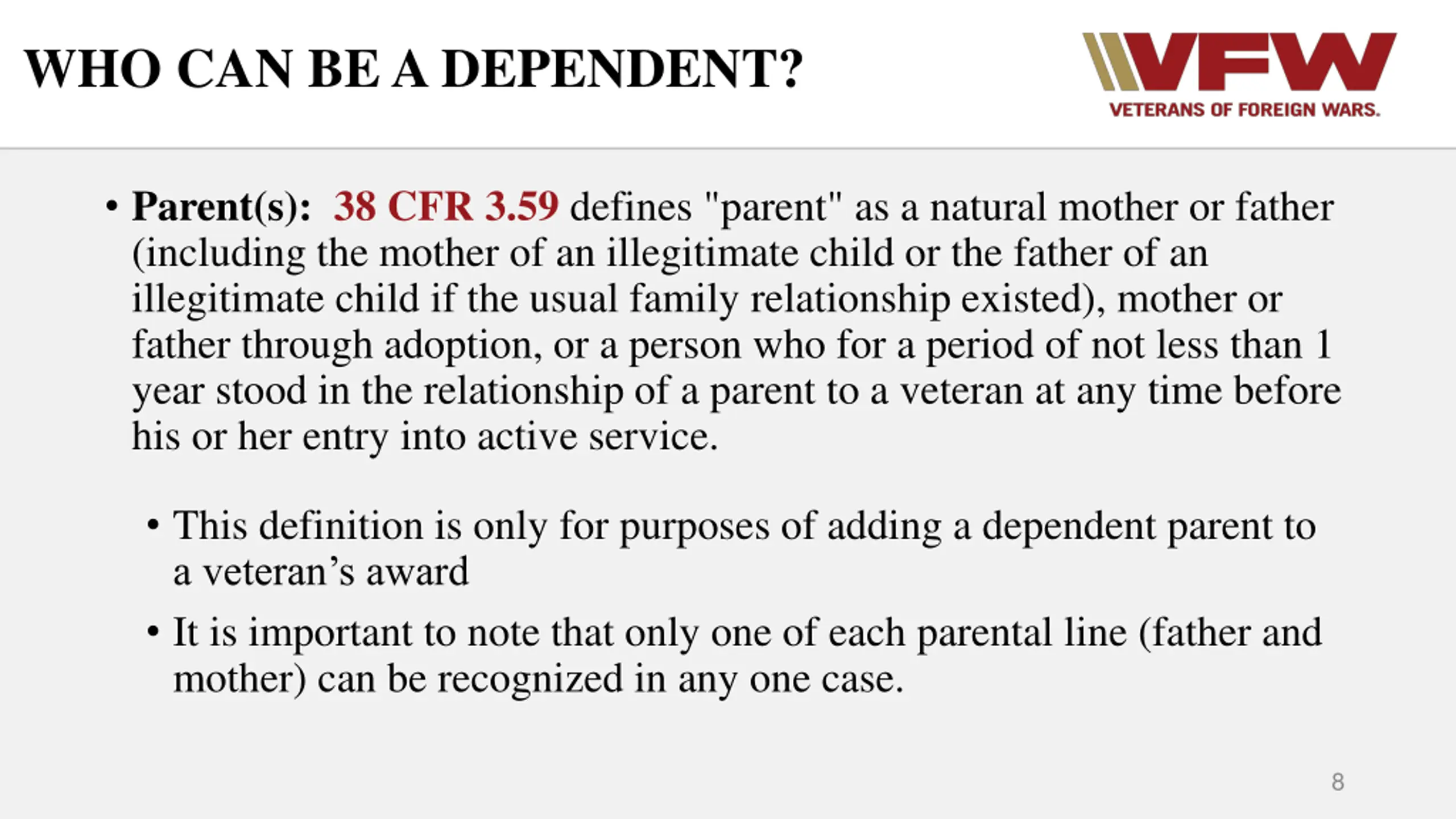 WHO CAN BE A DEPENDENT? Parent(s): 38 CFR 3.59 defines "parent" as a natural mother or father (including the mother of an illegitimate child or the father of an illegitimate child if the usual family relationship existed), mother or father through adoption, or a person who for a period of not less than 1 year stood in the relationship of a parent to a veteran at any time before his or her entry into active service. This definition is only for purposes of adding a dependent parent to a veteran s award It is important to note that only one of each parental line (father and mother) can be recognized in any one case. 8