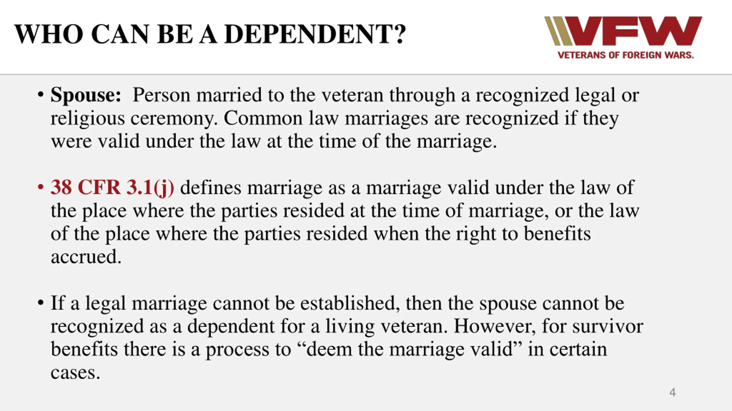 WHO CAN BE A DEPENDENT? Spouse: Person married to the veteran through a recognized legal or religious ceremony. Common law marriages are recognized if they were valid under the law at the time of the marriage. 38 CFR 3.1(j) defines marriage as a marriage valid under the law of the place where the parties resided at the time of marriage, or the law of the place where the parties resided when the right to benefits accrued. If a legal marriage cannot be established, then the spouse cannot be recognized as a dependent for a living veteran. However, for survivor benefits there is a process to deem the marriage valid in certain cases. 4