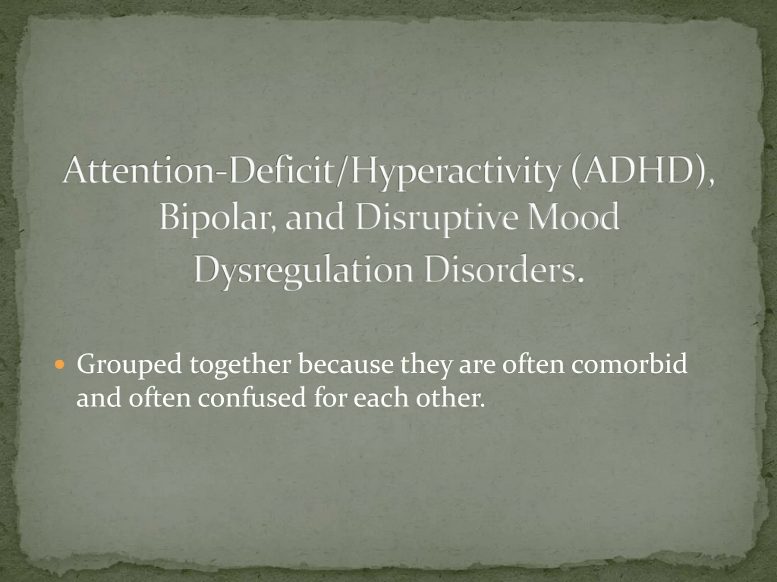 Attention-Deficit/Hyperactivity (ADHD), Bipolar, and Disruptive Mood Dysregulation Disorders. Grouped together because they are often comorbid and often confused for each other.
