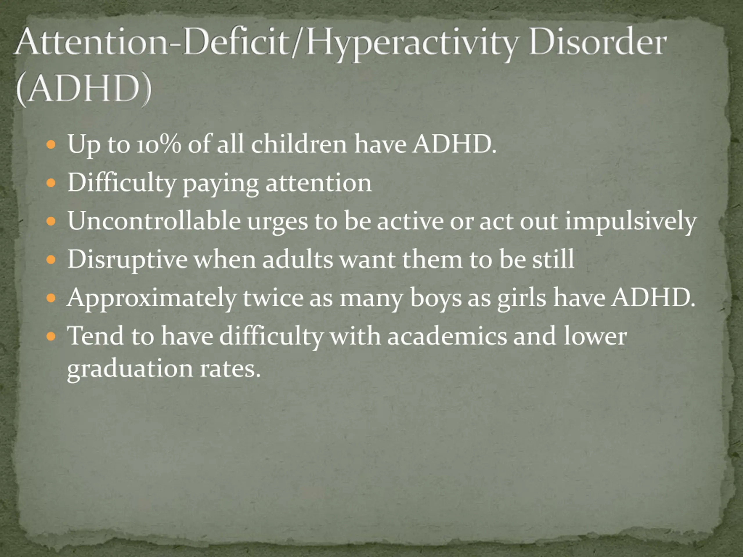 Attention-Deficit/Hyperactivity Disorder (ADHD) Up to 10% of all children have ADHD. Difficulty paying attention Uncontrollable urges to be active or act out impulsively Disruptive when adults want them to be still Approximately twice as many boys as girls have ADHD. Tend to have difficulty with academics and lower graduation rates.