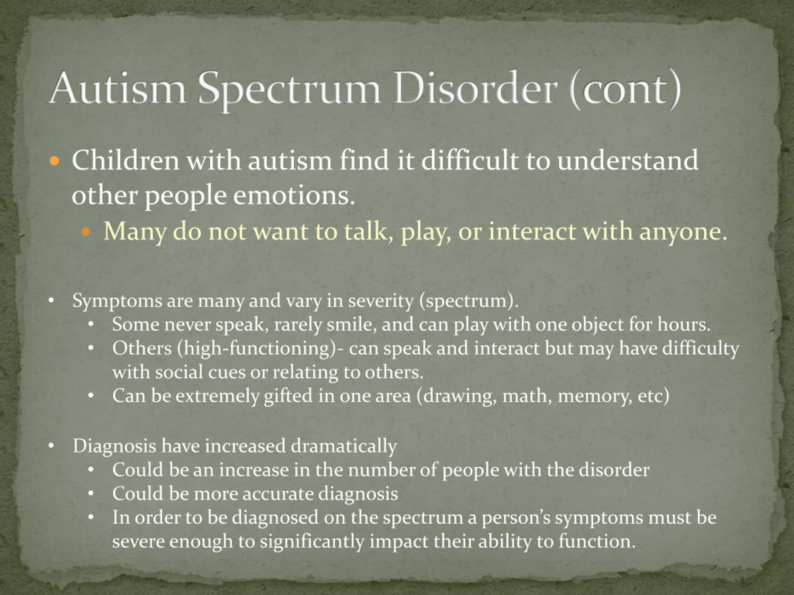 Autism Spectrum Disorder (cont) Children with autism find it difficult to understand other people emotions. Many do not want to talk, play, or interact with anyone. Symptoms are many and vary in severity (spectrum). Some never speak, rarely smile, and can play with one object for hours. Others (high-functioning)- can speak and interact but may have difficulty with social cues or relating to others. Can be extremely gifted in one area (drawing, math, memory, etc) Diagnosis have increased dramatically Could be an increase in the number of people with the disorder Could be more accurate diagnosis In order to be diagnosed on the spectrum a person s symptoms must be severe enough to significantly impact their ability to function.