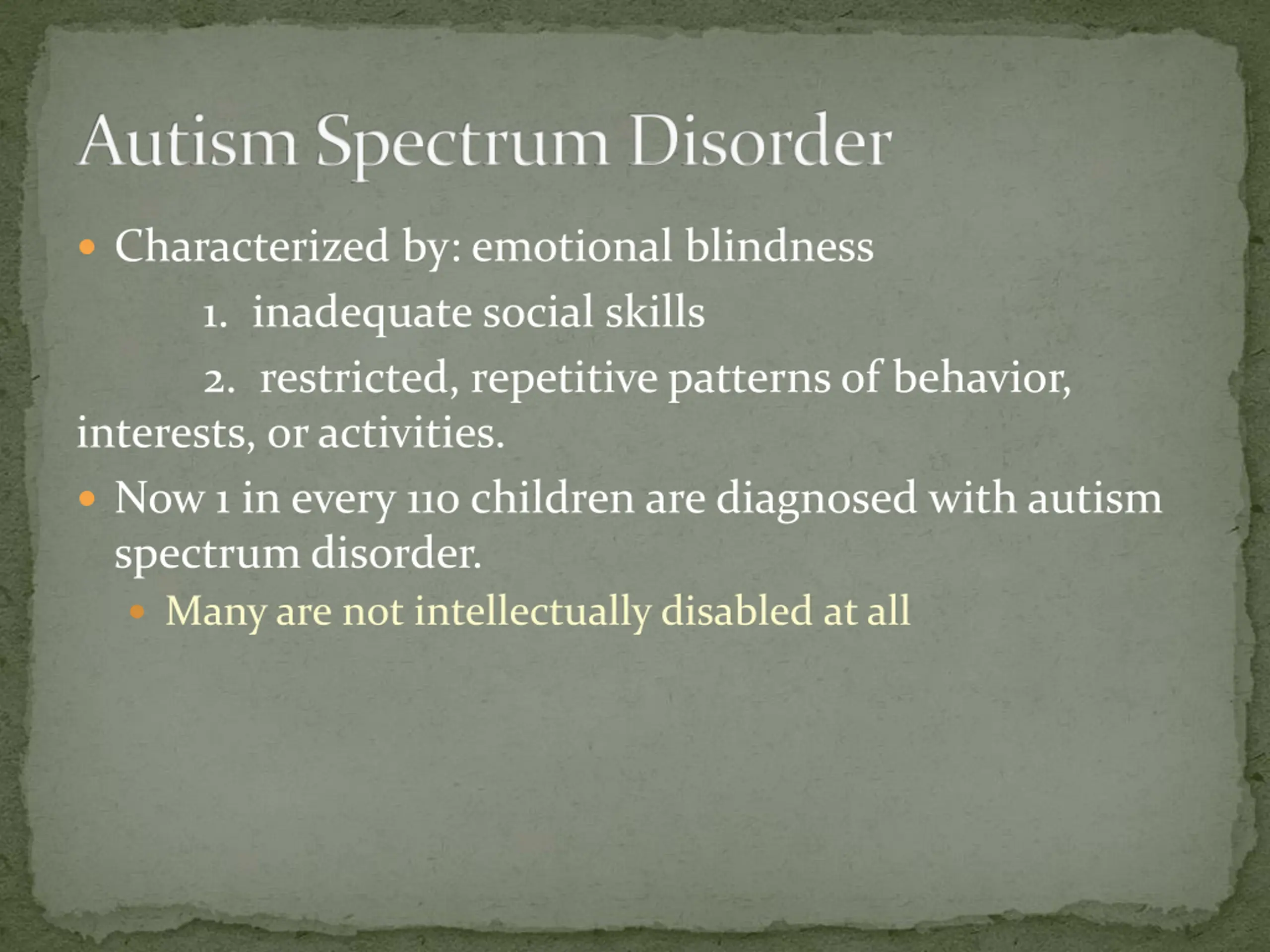 Autism Spectrum Disorder Characterized by: emotional blindness 1. inadequate social skills 2. restricted, repetitive patterns of behavior, interests, or activities. Now 1 in every 110 children are diagnosed with autism spectrum disorder. Many are not intellectually disabled at all