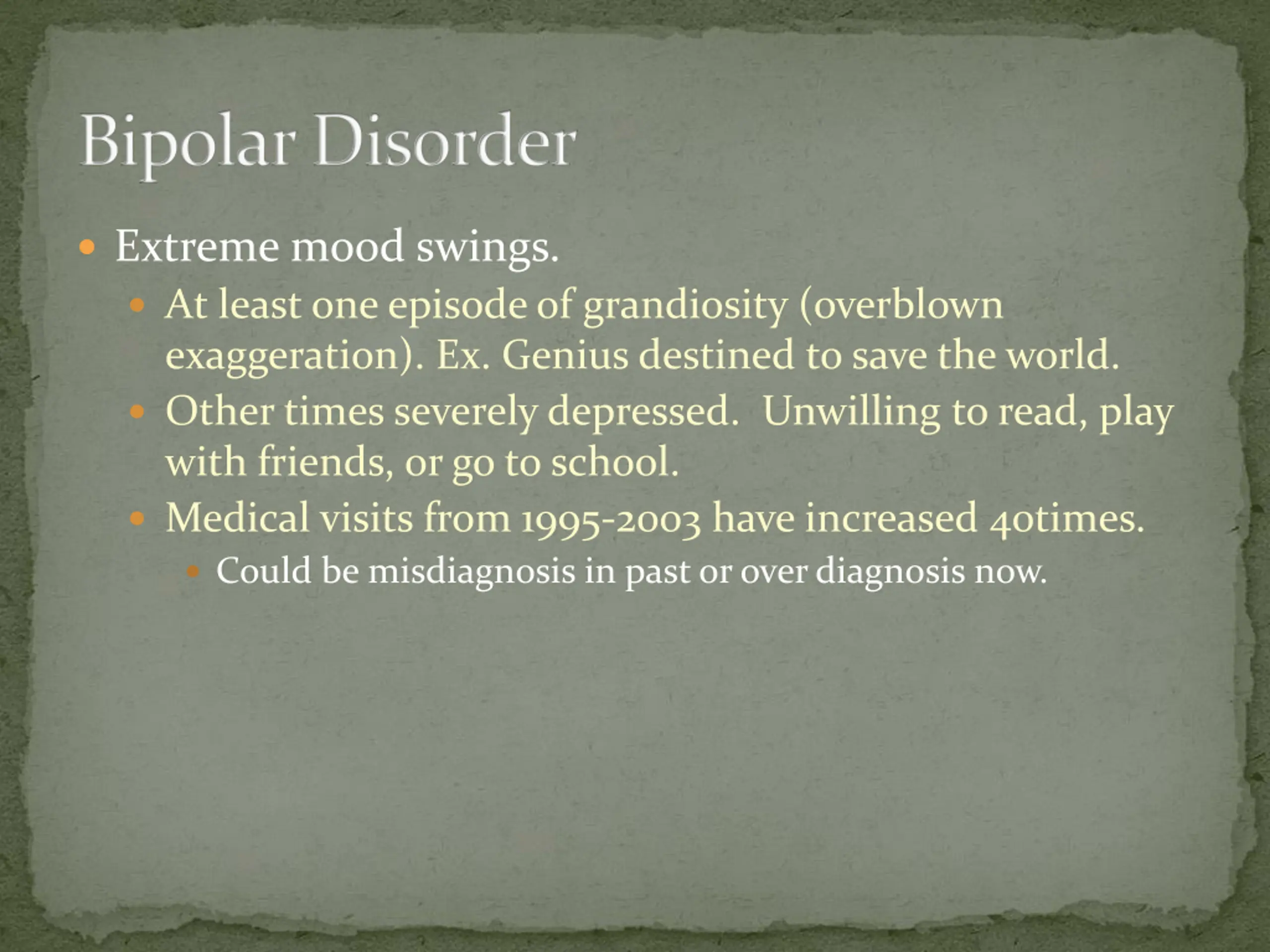 Bipolar Disorder Extreme mood swings. At least one episode of grandiosity (overblown exaggeration). Ex. Genius destined to save the world. Other times severely depressed. Unwilling to read, play with friends, or go to school. Medical visits from 1995-2003 have increased 40times. Could be misdiagnosis in past or over diagnosis now.