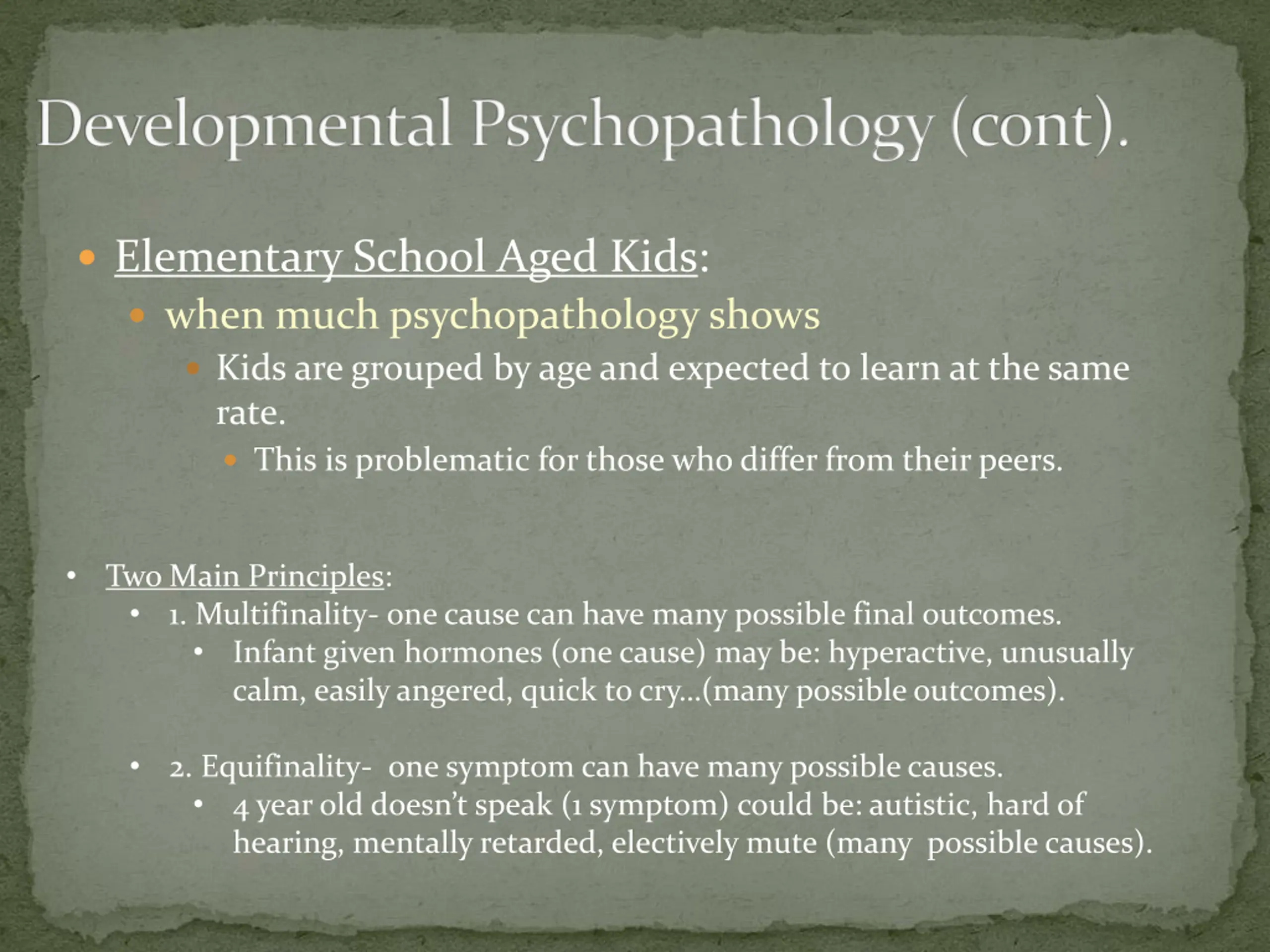 Developmental Psychopathology (cont). Elementary School Aged Kids: when much psychopathology shows Kids are grouped by age and expected to learn at the same rate. This is problematic for those who differ from their peers. Two Main Principles: 1. Multifinality- one cause can have many possible final outcomes. Infant given hormones (one cause) may be: hyperactive, unusually calm, easily angered, quick to cry (many possible outcomes). 2. Equifinality- one symptom can have many possible causes. 4 year old doesn t speak (1 symptom) could be: autistic, hard of hearing, mentally retarded, electively mute (many possible causes).