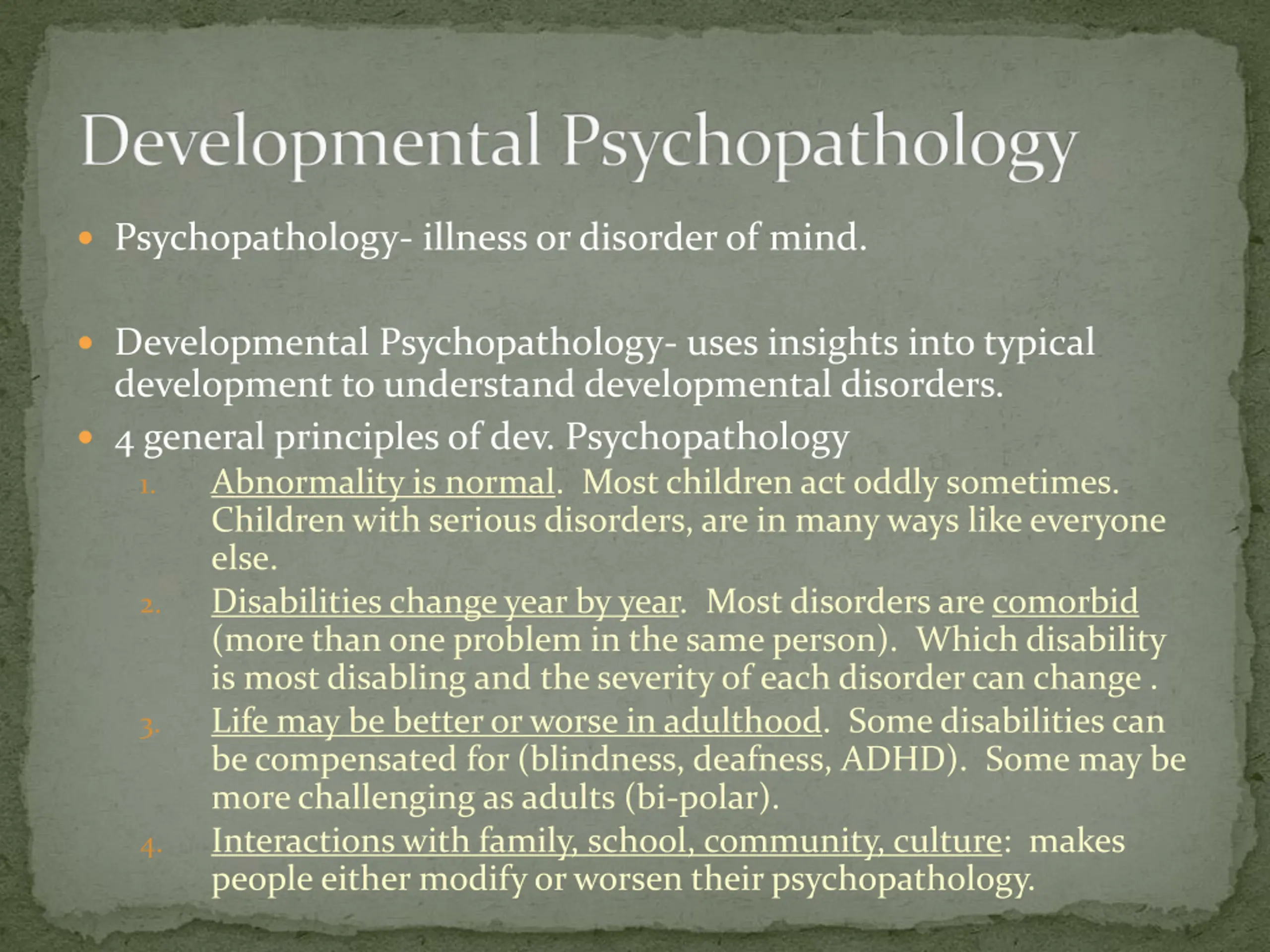 Developmental Psychopathology Psychopathology- illness or disorder of mind. Developmental Psychopathology- uses insights into typical development to understand developmental disorders. 4 general principles of dev. Psychopathology 1. Abnormality is normal. Most children act oddly sometimes. Children with serious disorders, are in many ways like everyone else. 2. Disabilities change year by year. Most disorders are comorbid (more than one problem in the same person). Which disability is most disabling and the severity of each disorder can change . 3. Life may be better or worse in adulthood. Some disabilities can be compensated for (blindness, deafness, ADHD). Some may be more challenging as adults (bi-polar). 4. Interactions with family, school, community, culture: makes people either modify or worsen their psychopathology.