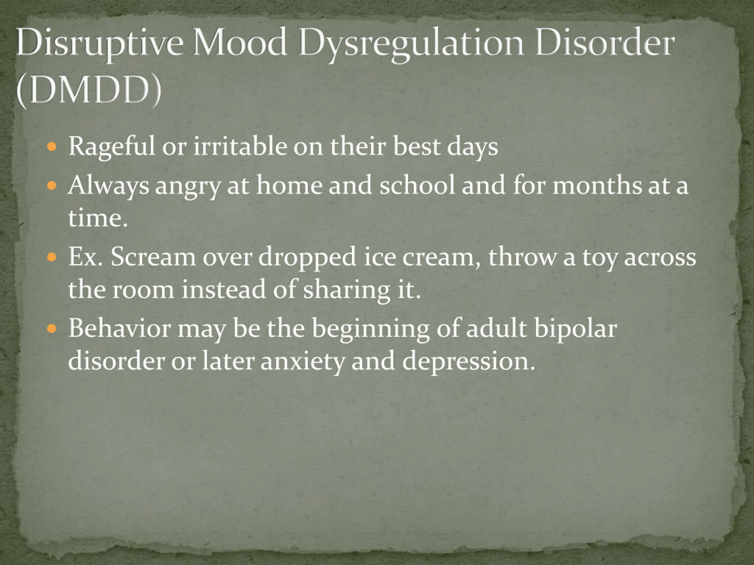 Disruptive Mood Dysregulation Disorder (DMDD) Rageful or irritable on their best days Always angry at home and school and for months at a time. Ex. Scream over dropped ice cream, throw a toy across the room instead of sharing it. Behavior may be the beginning of adult bipolar disorder or later anxiety and depression.