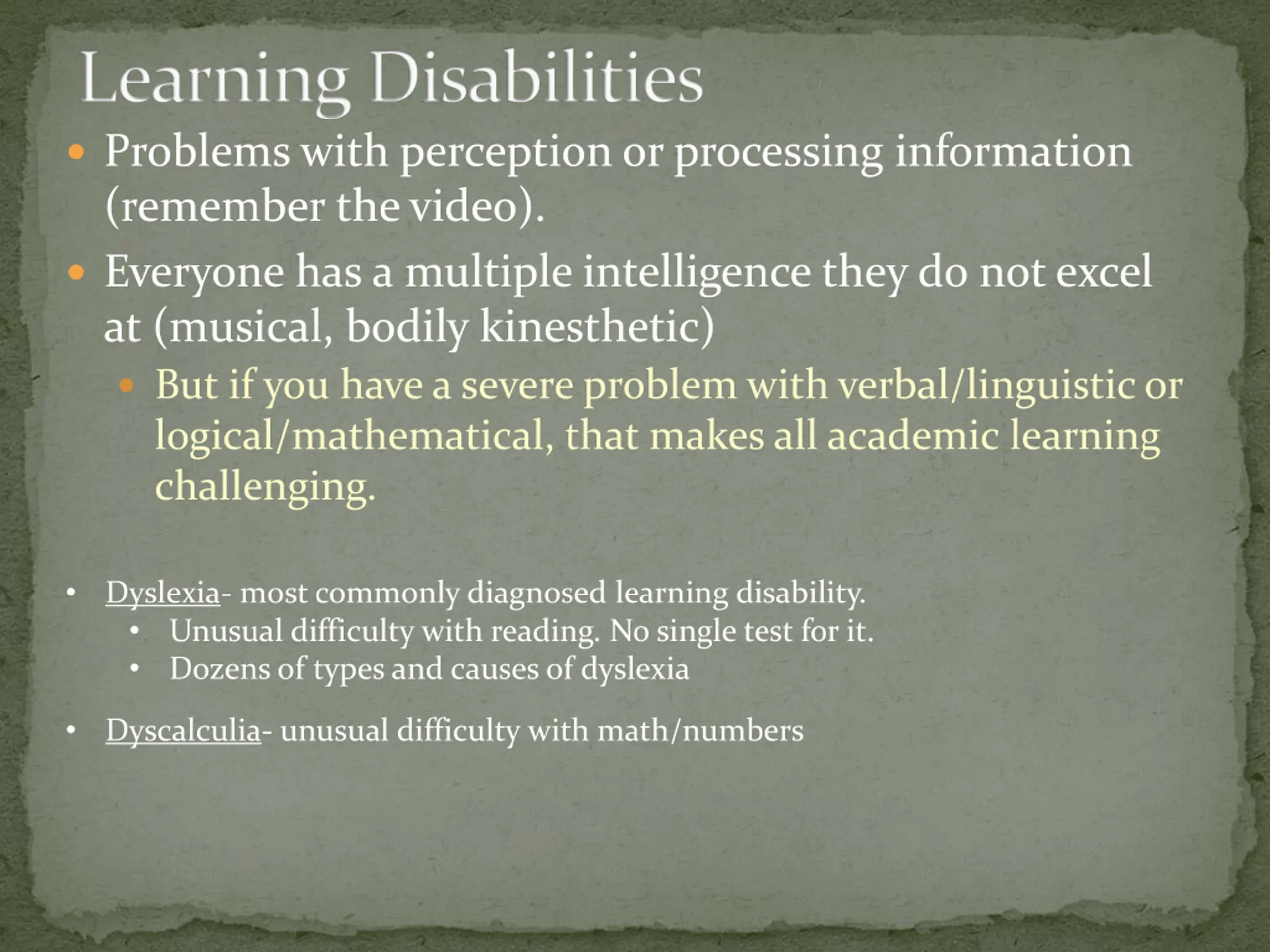Learning Disabilities Problems with perception or processing information (remember the video). Everyone has a multiple intelligence they do not excel at (musical, bodily kinesthetic) But if you have a severe problem with verbal/linguistic or logical/mathematical, that makes all academic learning challenging. Dyslexia- most commonly diagnosed learning disability. Unusual difficulty with reading. No single test for it. Dozens of types and causes of dyslexia Dyscalculia- unusual difficulty with math/numbers