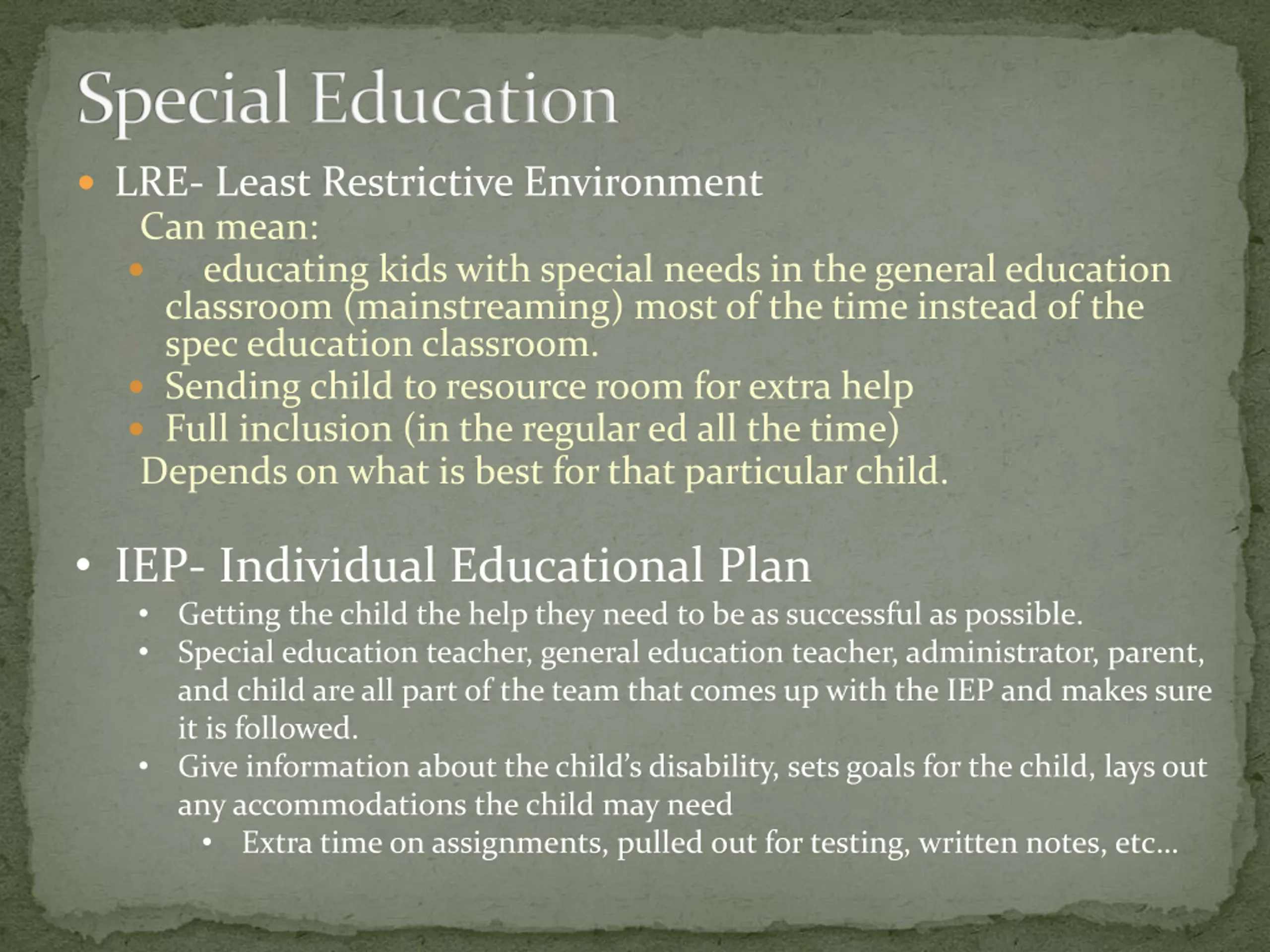 Special Education LRE- Least Restrictive Environment Can mean: educating kids with special needs in the general education classroom (mainstreaming) most of the time instead of the spec education classroom. Sending child to resource room for extra help Full inclusion (in the regular ed all the time) Depends on what is best for that particular child. IEP- Individual Educational Plan Getting the child the help they need to be as successful as possible. Special education teacher, general education teacher, administrator, parent, and child are all part of the team that comes up with the IEP and makes sure it is followed. Give information about the child s disability, sets goals for the child, lays out any accommodations the child may need Extra time on assignments, pulled out for testing, written notes, etc