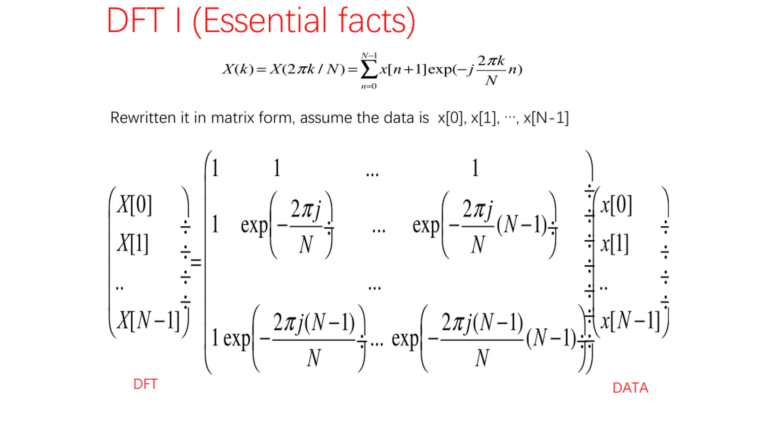 DFT I (Essential facts) N-1 x[n+1]exp(-j2pk X(k)= X(2pk / N)= n) N n=0 Rewritten it in matrix form, assume the data is x[0], x[1], , x[N-1] 1 1 ... 1 X[0] X[1] .. X[N -1] x[0] x[1] .. x[N -1] exp -2p j exp -2p j (N -1) 1 ... N N = ... ... exp -2p j(N -1) 1exp -2p j(N -1) (N -1) N N DFT DATA